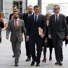 El presidente de Ciudadanos, Albert Rivera (c), a su llegada esta mañana al Congreso de los Diputados.