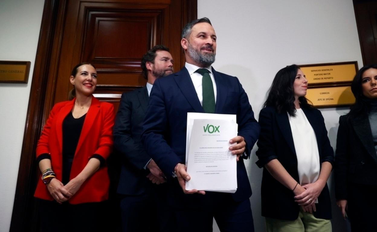 El presidente de Vox, Santiago Abascal, formaliza este lunes en el Registro del Congreso de los Diputados en Madrid una moción de censura contra Pedro Sánchez. EFE/ Juan Carlos Hidalgo | Vídeo: Atlas