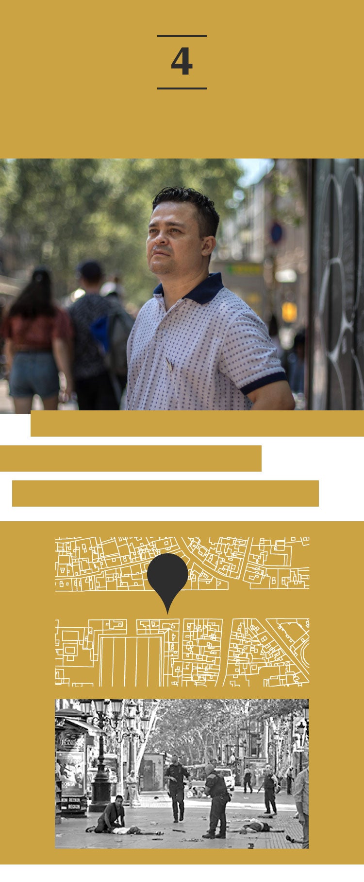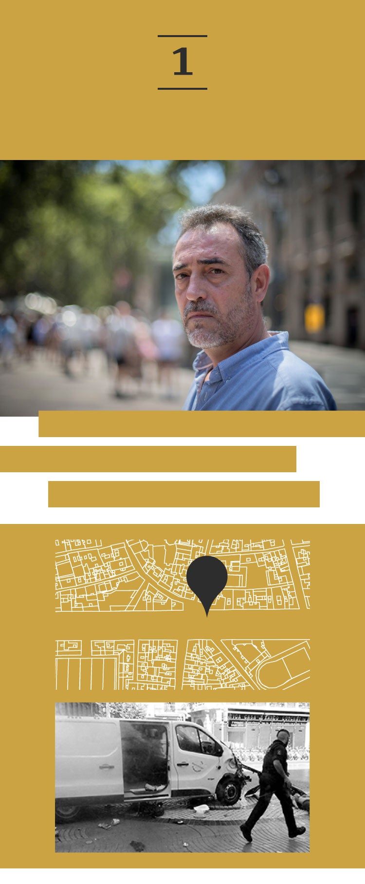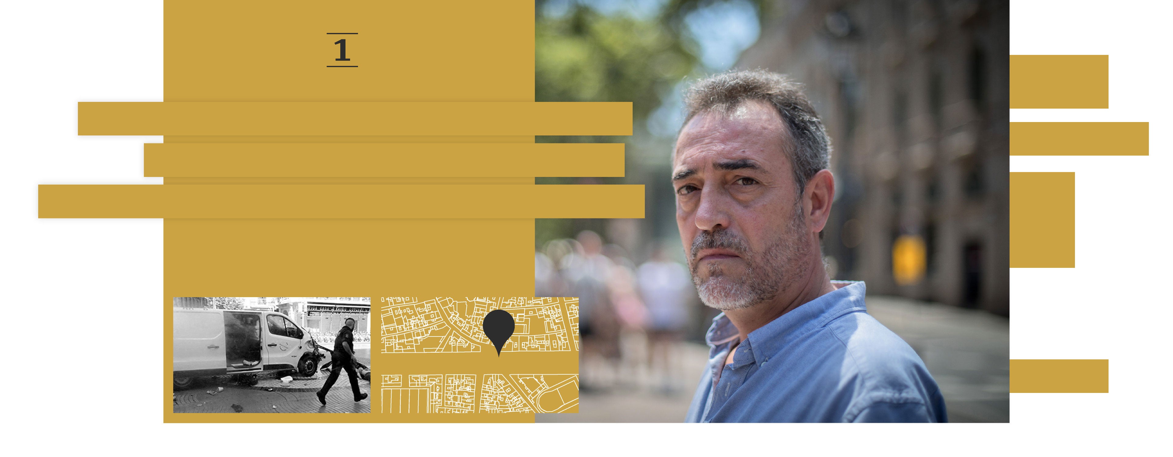 Quioscos convertidos en armas. No solo para Virginia. A Carlos Andrés Valencia, otros de los quioscos de las Ramblas, le destrozó el codo derecho. De hecho, este colombiano, todavía hoy, hay veces que se ve obligado a portar el cabestrillo. La furgoneta, solo unos metros antes de frenar, embistió un último quiosco y parte de la estructura cayó sobre Carlos, que instintivamente intentó salvarse de lo que se le venía encima. «Era mi día libre y había venido al centro, a Western Union, para hacerle la transferencia mensual a mis hijas. Escuché de pronto un ruido. Al principio pensé que era gente de juerga. Pero por esas cosas de Dios, me dio por voltear a mirar cuando vi que venía la furgoneta prácticamente encima. Solo me dio tiempo a echarme al lado del quiosco, pero toda la estructura se me cayó encima». Ese último golpe hizo frenar definitivamente la furgoneta a la altura del famoso mural de Miró. Allí acabaron los 550 metros de la matanza de Younes Abouyaaqoub. Aquí acaba hoy también el paseo de Javier, Edita, Virginia y Carlos Andrés. Los tres últimos contienen la respiración mientras observan a Javier, que tiene la mirada perdida en la acera en la que la furgoneta lanzó a su hijo instantes antes de frenarse por fin.