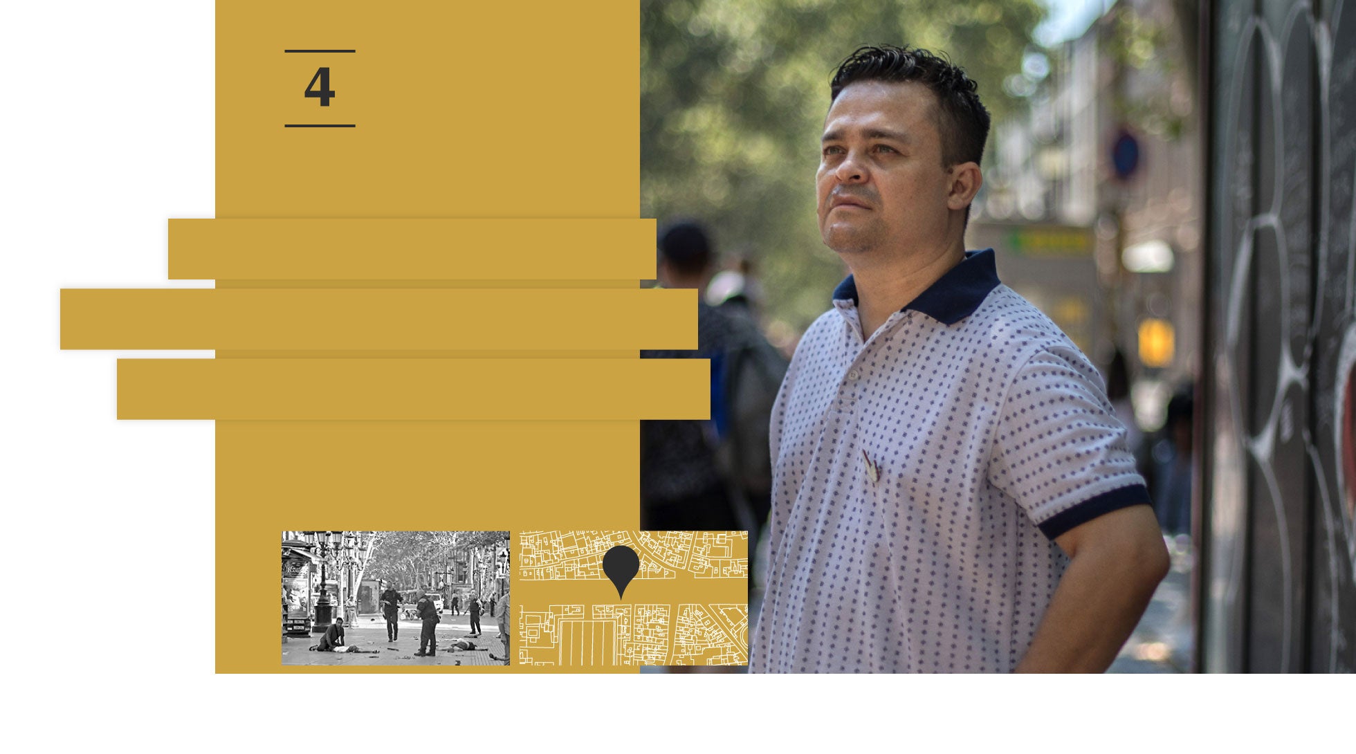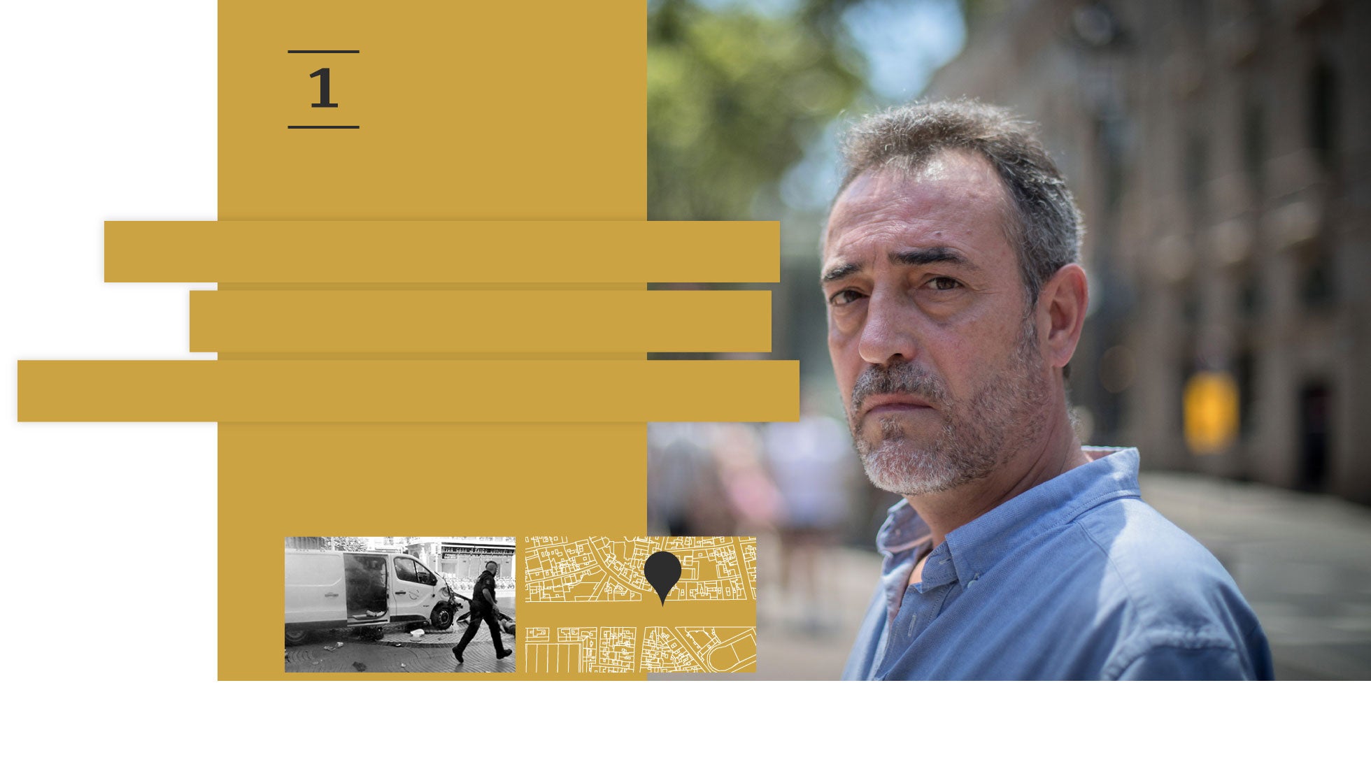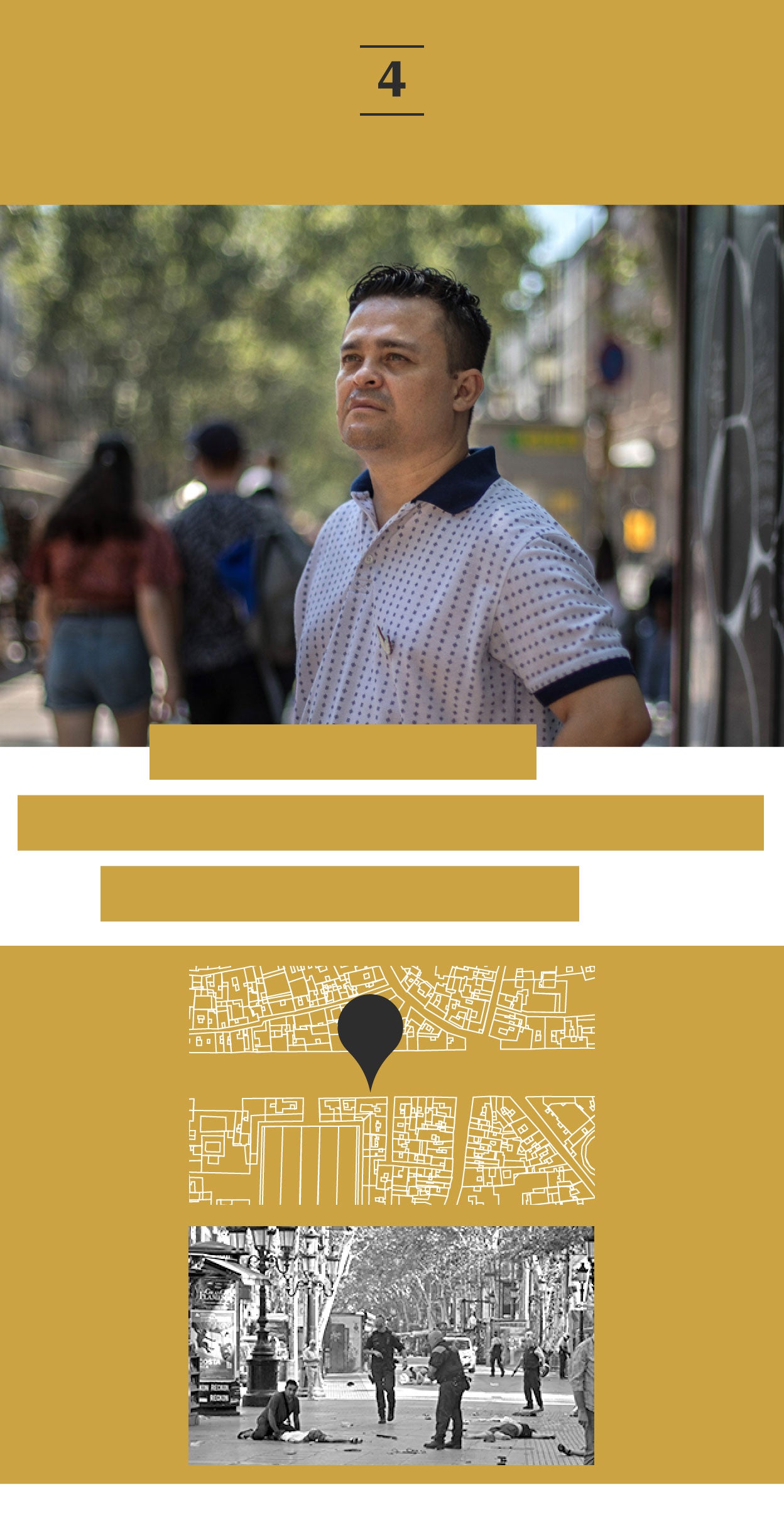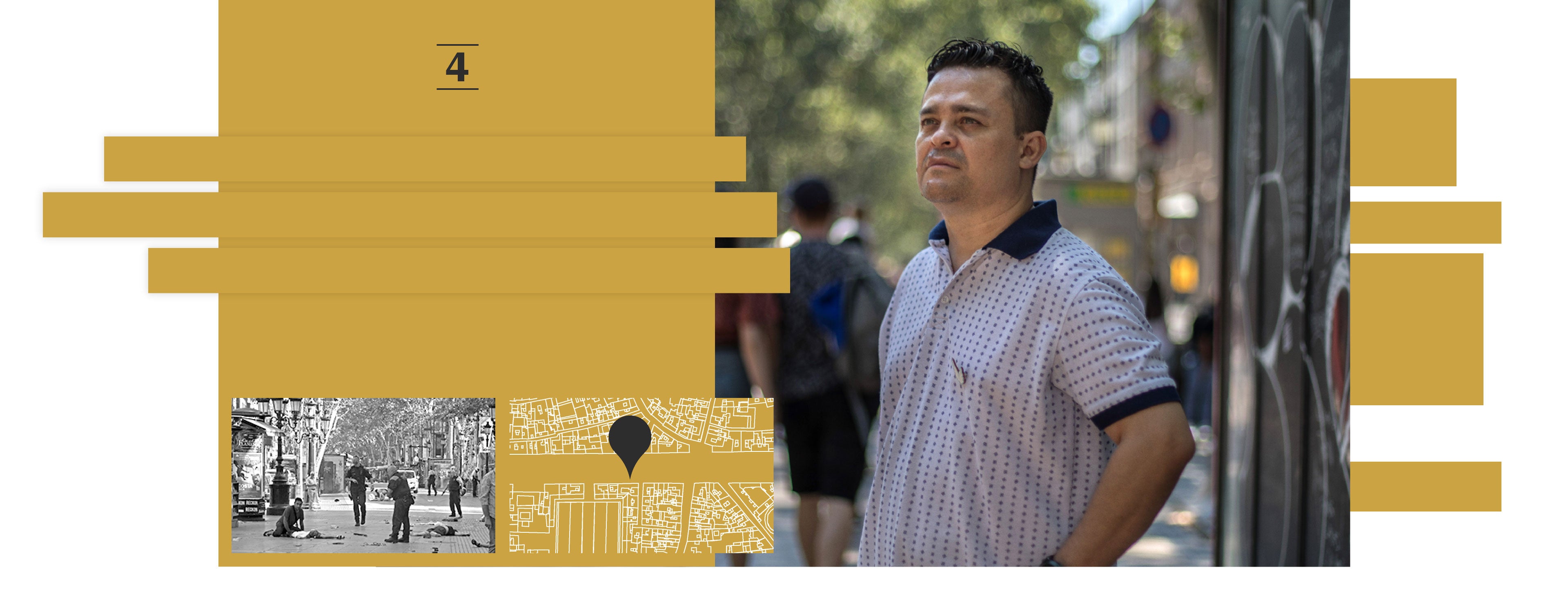 Quioscos convertidos en armas. No solo para Virginia. A Carlos Andrés Valencia, otros de los quioscos de las Ramblas, le destrozó el codo derecho. De hecho, este colombiano, todavía hoy, hay veces que se ve obligado a portar el cabestrillo. La furgoneta, solo unos metros antes de frenar, embistió un último quiosco y parte de la estructura cayó sobre Carlos, que instintivamente intentó salvarse de lo que se le venía encima. «Era mi día libre y había venido al centro, a Western Union, para hacerle la transferencia mensual a mis hijas. Escuché de pronto un ruido. Al principio pensé que era gente de juerga. Pero por esas cosas de Dios, me dio por voltear a mirar cuando vi que venía la furgoneta prácticamente encima. Solo me dio tiempo a echarme al lado del quiosco, pero toda la estructura se me cayó encima». Ese último golpe hizo frenar definitivamente la furgoneta a la altura del famoso mural de Miró. Allí acabaron los 550 metros de la matanza de Younes Abouyaaqoub. Aquí acaba hoy también el paseo de Javier, Edita, Virginia y Carlos Andrés. Los tres últimos contienen la respiración mientras observan a Javier, que tiene la mirada perdida en la acera en la que la furgoneta lanzó a su hijo instantes antes de frenarse por fin.