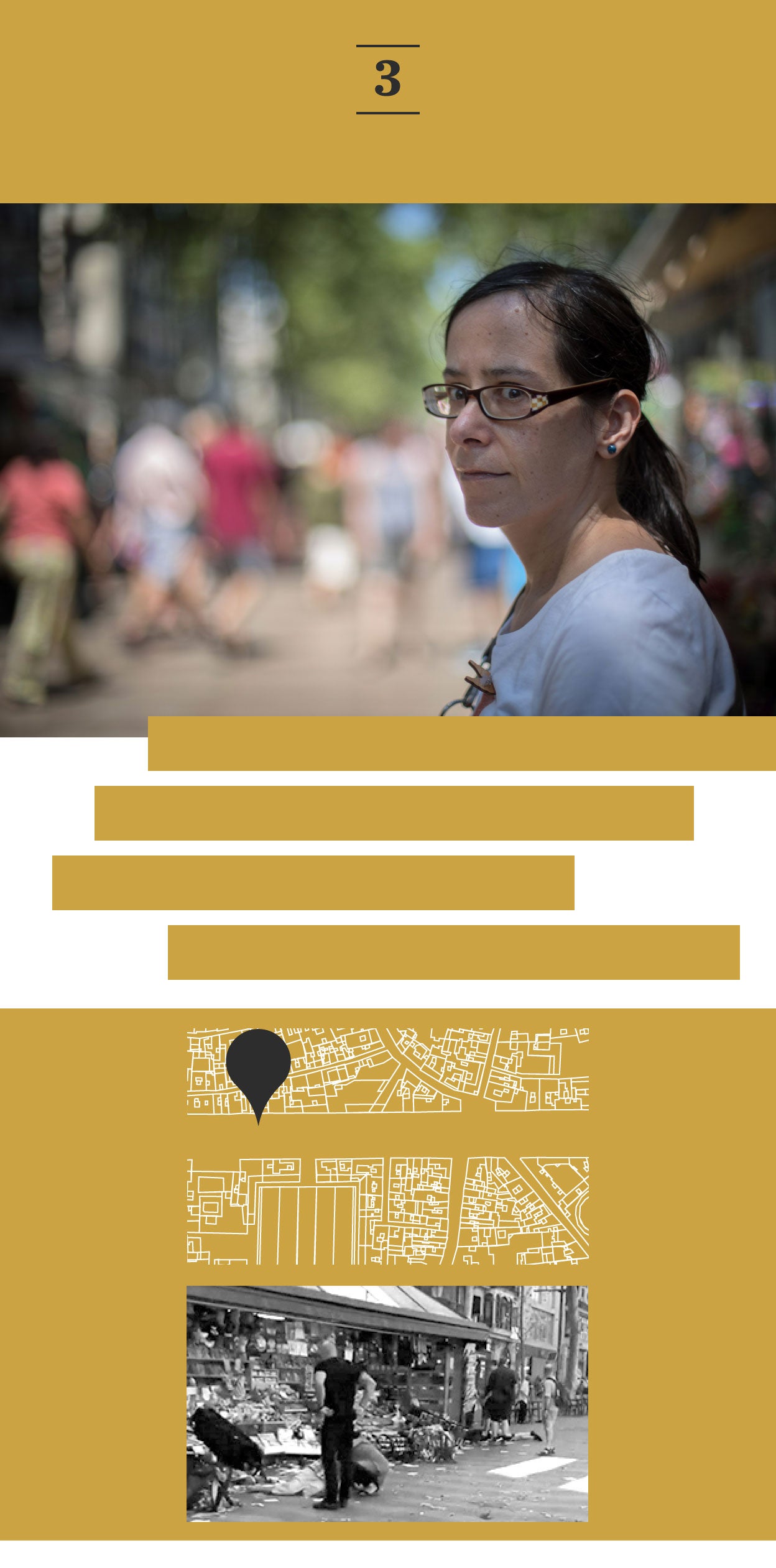 Edita escucha absorta las palabras de Javier. Cada dos por tres rompe a llorar. Es un verdadero manojo de nervios. Desde el atentado no había puesto un pie en las Ramblas. De hecho, aunque se mueve por asiduidad por el centro de Barcelona, siempre las evita. Desde aquel 17-A está en tratamiento. Ella, como Javier, no es capaz de escuchar una sirena sin llevarse un respingo. El enésimo vehículo de emergencias y volver a las Ramblas le aviva los recuerdos. «¡Boom! ¡boom! ¡boom!… ¡plas! ¡ plas! ¡plas!… el sonido de la furgoneta llevándose por delante a la gente todavía retumba en mi cabeza. ¡Plas! ¡ plas! ¡plas!».