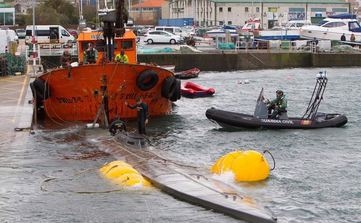 La rotura de los arneses que sujetaban los flotadores se produjo cuando se procedía a colocar el sumergible sobre la rampa de acceso al muelle, aprovechando la pleamar. Al cierre de esta edición dos grandes grúas del puerto de Aldán trataban de reflotar de nuevo la embarcación. Mientras, un completo dispositivo formado por varias decenas de agentes de la Guardia Civil y la Policía Nacional, además de funcionarios de Vigilancia Aduanera, esperaban a la inspección del interior del artefacto y el pesaje de la mercancía que portaba, que oscila entre los 3.000 y los 3.500 kilos. Dicho alijo implica un valor de mercado que supera los 100 millones de euros.