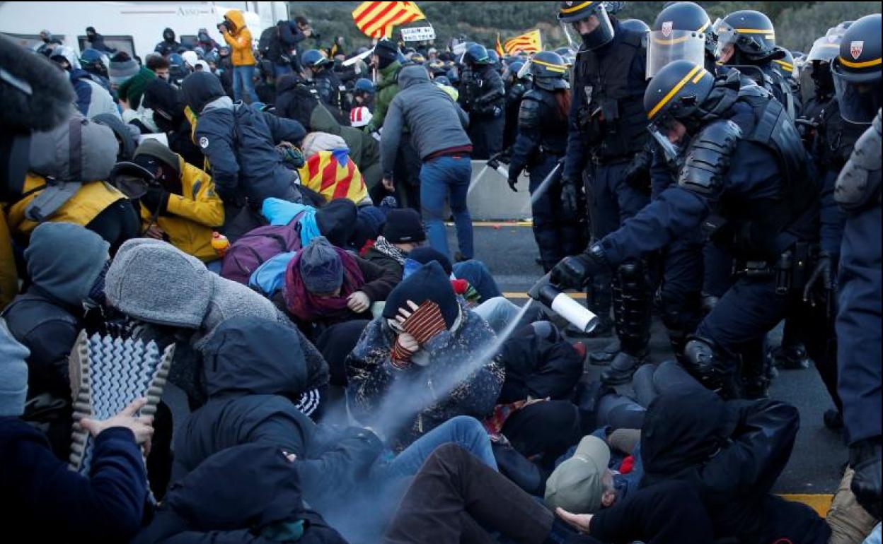El Ministerio del Interior galo ha desplazado a la zona 150 antidisturbios, que no han tenido que cargar, aunque se han empleando con fuerza durante más de una hora para mover a los cientos de congregados unos 800 metros, hasta llevar a los manifestantes al lado español de la frontera. .
