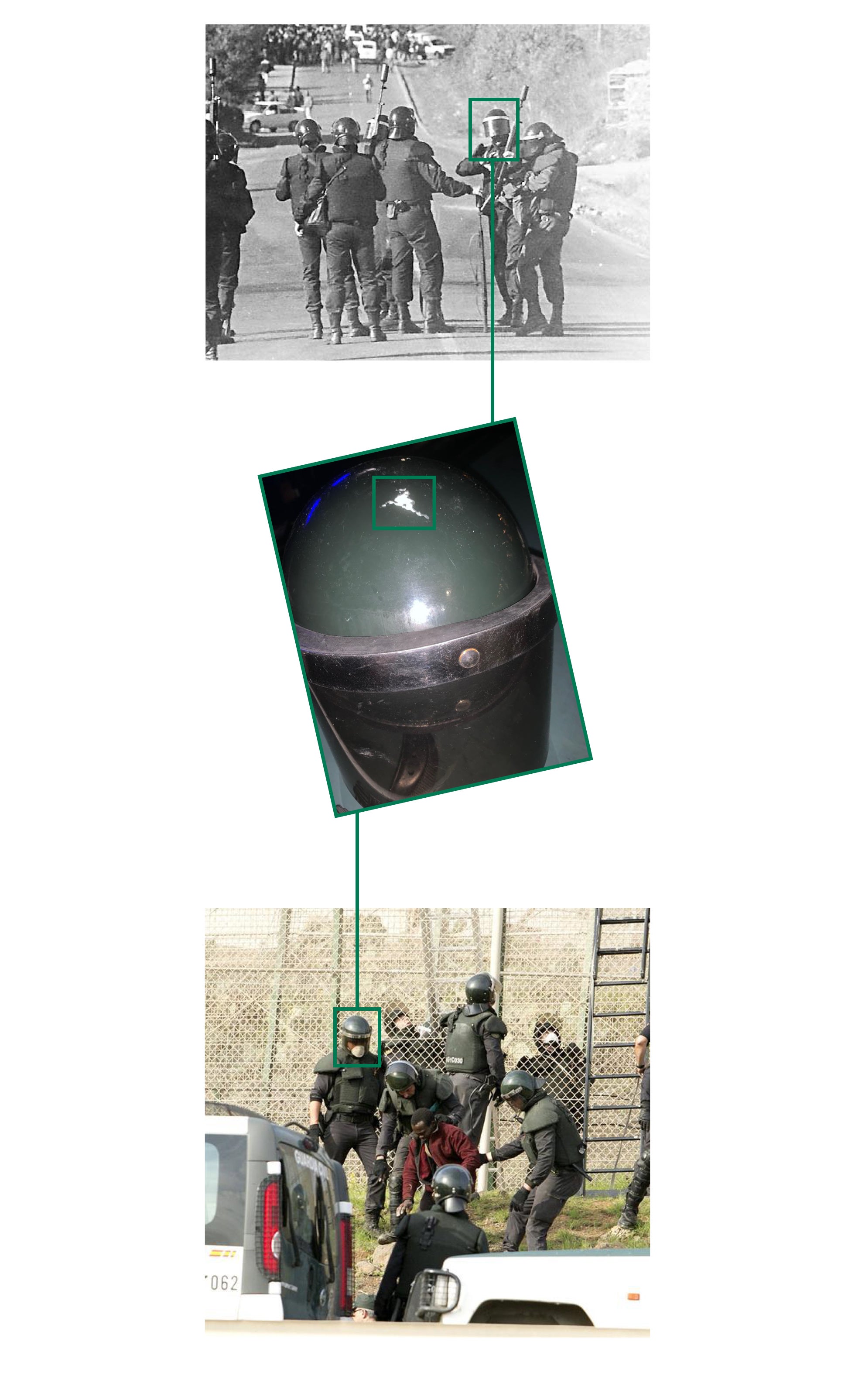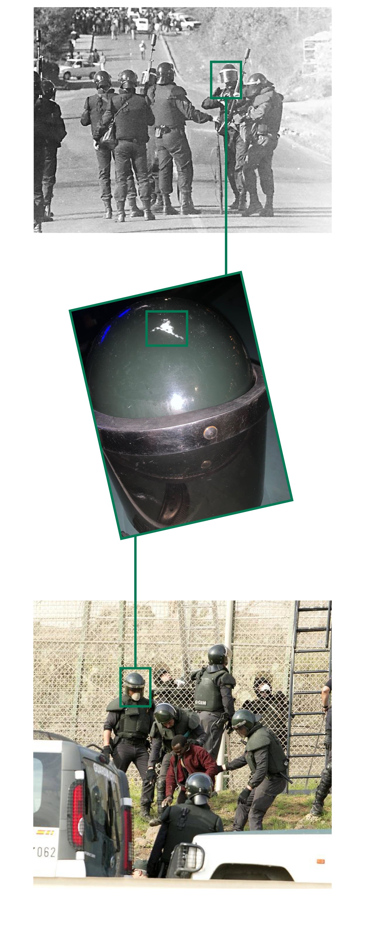 «No es que se trate del mismo modelo, es que son exactamente los mismos cascos que han pasado de mano en mano, mejor dicho de cabeza en cabeza, desde hace cuarenta años», aclara uno de los responsables del instituto armado en la ciudad. Con ese larguísimo historial de servicio no es de extrañar que uno de los agentes que intervenía en el famoso salto del pasado 24 de junio, que acabó con entre 23 y 72 inmigrantes muertos, se desplomara inconsciente cuando una pedrada rompió su casco.