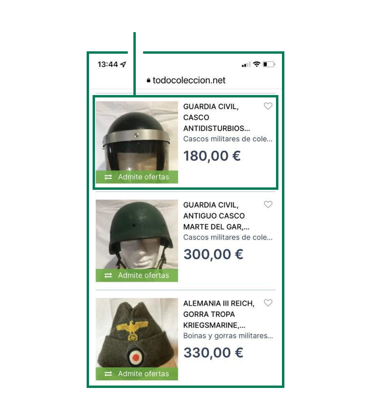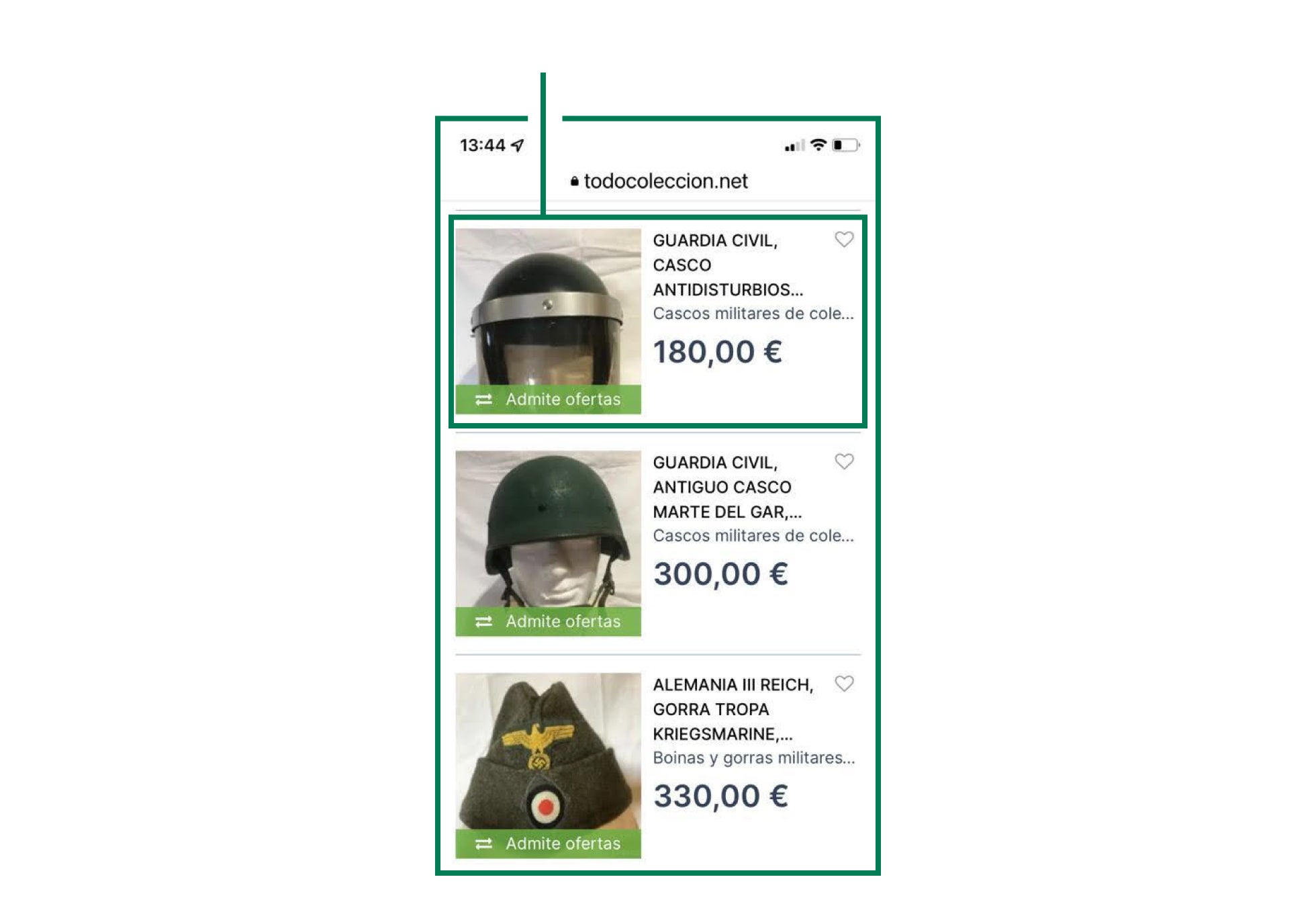Se llama 'Todocolección.net' y es uno de los portales de referencia para los apasionados del material militar histórico. En esa web, junto a una gorra de la marina de guerra nazi (Kriegsmarine) o de un gorro de oficial médico del Tercer Reich, se oferta por 180 euros otra vetusta pieza de militaria: un casco verde de antidisturbios de la Guardia Civil de los que usaban los agentes del instituto armado en las algaradas de los ochenta en la reconversión industrial, minera o naval en diferentes puntos de España.