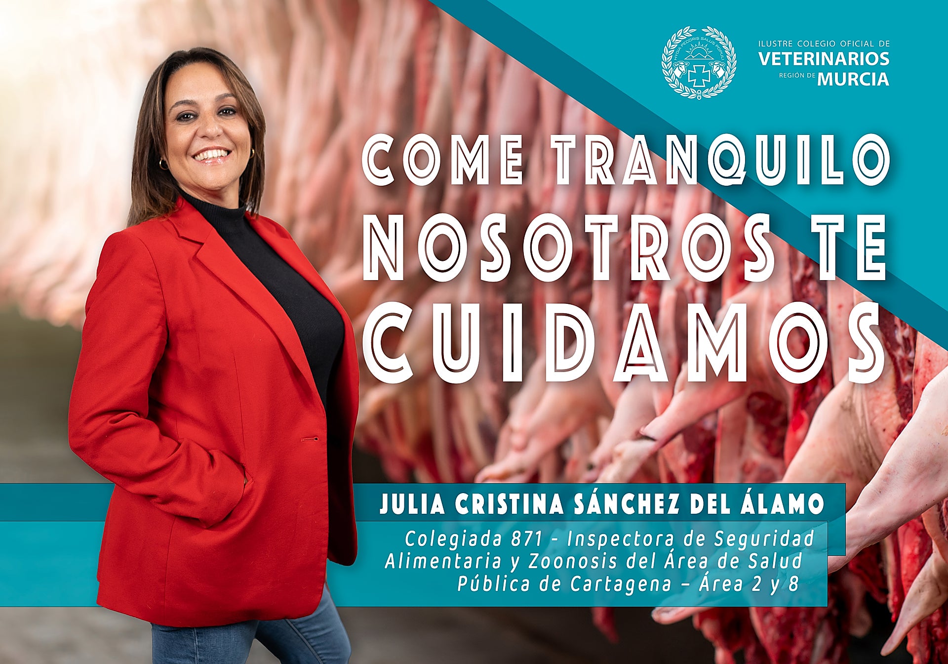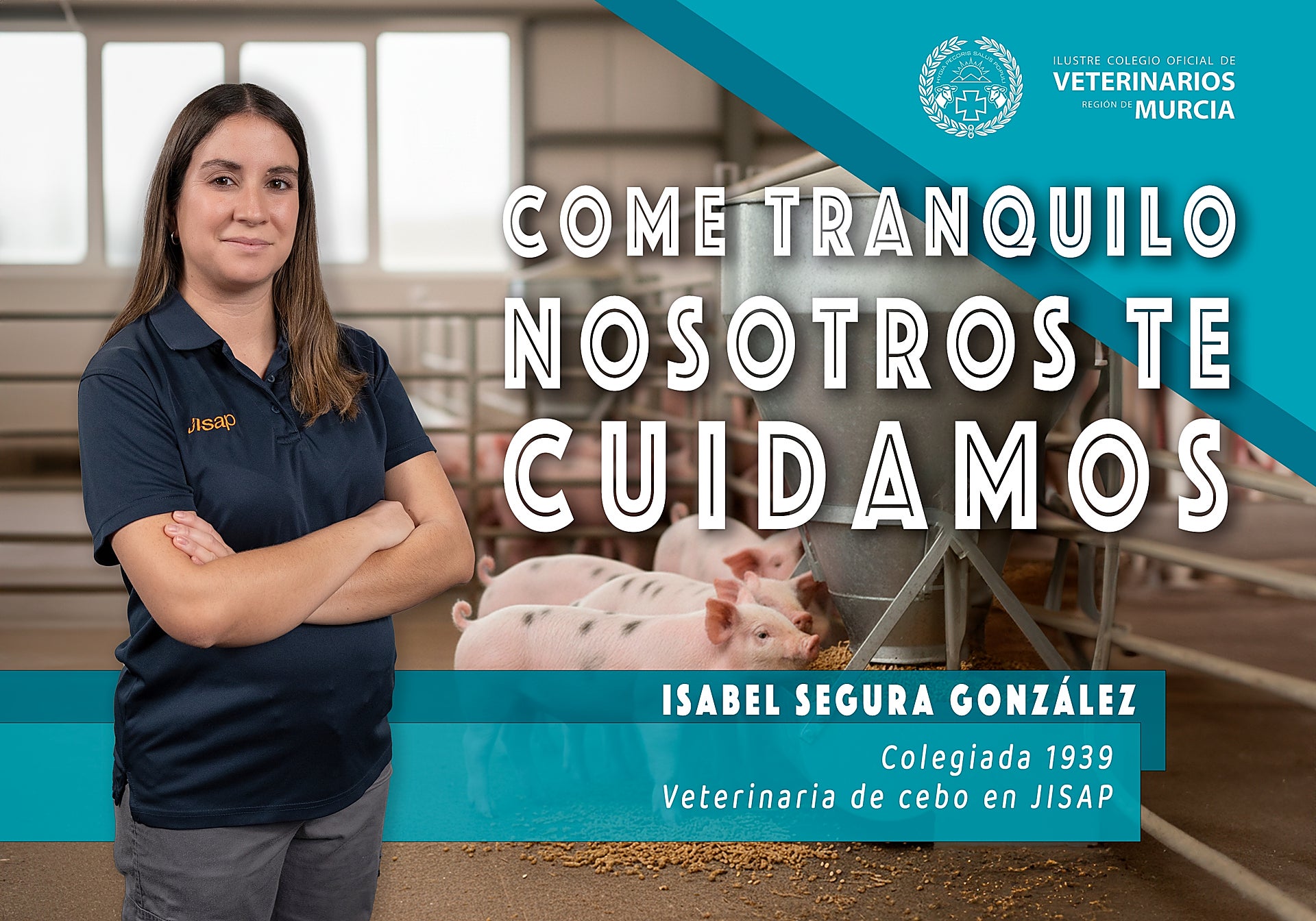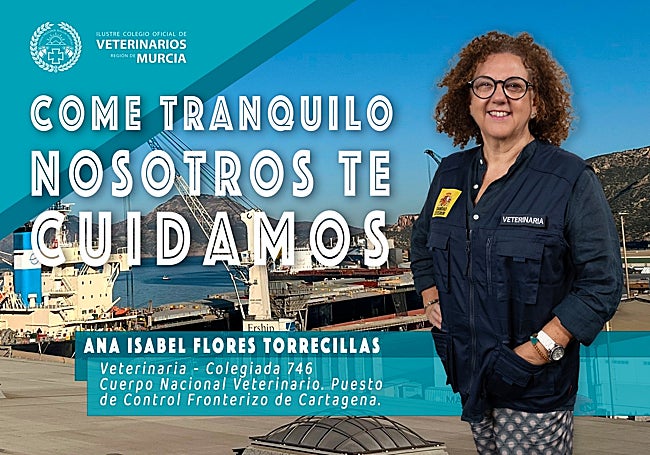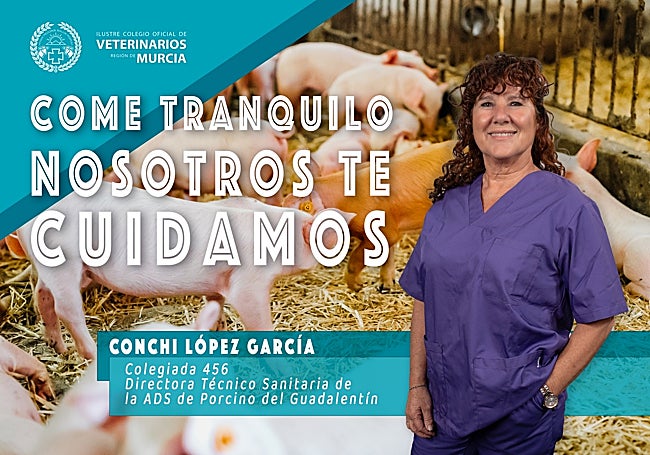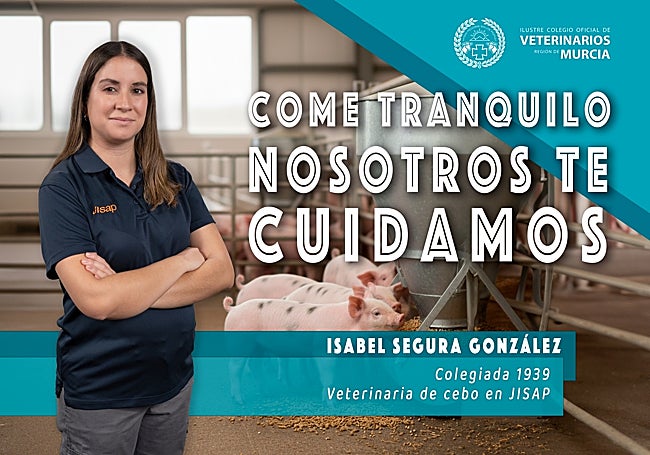 La campaña del Colegio de Veterinarios pone rostro a esta cadena de confianza a través de cinco profesionales que representan cada eslabón. Se tratan de Ana Isabel Flores Torrecillas, del Cuerpo Nacional Veterinario, en el Puesto de Control Fronterizo de Cartagena; Conchi López García, directora técnico-sanitaria de la ADS de Porcino del Guadalentín; Isabel Segura González, veterinaria de cebo en JISAP; Julia Cristina Sánchez del Álamo, inspectora de Seguridad Alimentaria y Zoonosis del Área de Salud Pública de Cartagena, y Pedro Francisco Olivares Sánchez, responsable veterinario de ElPozo y de Seguridad Alimentaria del Grupo Fuertes.