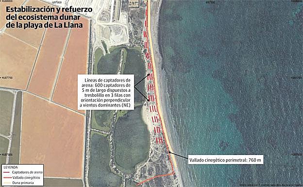 Por eso se ha vallado el acceso al interior a lo largo de los primeros 600 metros de playa. Al mismo tiempo, el mantenimiento junto al mar de la barrera de arribazones (acumulaciones de hojas muertas de posidonia que erróneamente se han retirado en algunas ocasiones) «protegen a las dunas de los temporales, lo que está permitiendo el rápido desarrollo de la vegetación, la retención de arena y la recuperación de los hábitats dunares», explica el coordinador de Life Salinas. «Los resultados están siendo espectaculares», afirma, coincidiendo textualmente con el balance que hacen Jorge Sánchez y Fulgencio Perona en «el ecuador del proyecto» (dos años lleva en marcha y otros dos le quedan). Pero Ballesteros baja en seguida los pies a tierra: «Es prácticamente imposible recuperar el aspecto de hace 65 años», cuando la playa de la Llana era más de cien metros más ancha y no se ejercía sobre la zona una presión de turistas que ahora «es infinitamente mayor del que había por aquel entonces». Ahora el puerto, recuerda Sánchez, impide el «transporte de arena norte-sur» que podría recuperar definitivamente el lugar.