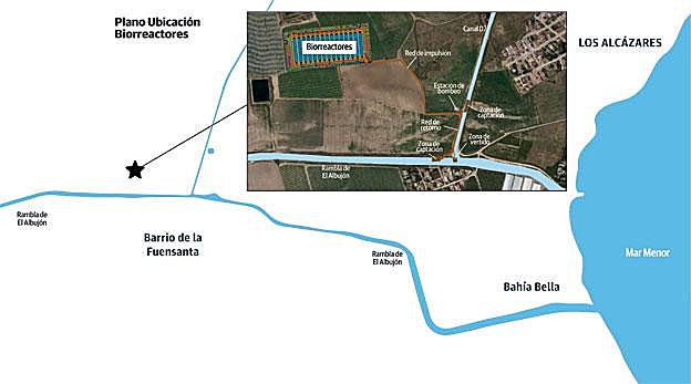La actuación en El Albujón está valorada en dos millones de euros, pagados en un 80% por el Fondo Europeo de Desarrollo Regional, y el 20% restante provienen de «fondos propios asociados de la Comunidad Autónoma de la Región de Murcia», especifica el consejero de Agua, Agricultura, Ganadería, Pesca y Medio Ambiente, Antonio Luengo. En síntesis, consiste en un complejo de cinco hectáreas en Los Alcázares en el que van a habilitarse 15 balsas de astillas de madera, de 100 por 14 metros y casi dos millones de metros cúbicos de capacidad total, lo que va a permitir desnitrificar un flujo de hasta 200 litros de agua por segundo. De este modo, según sus artífices, «se consigue tratar el cien por cien del caudal circulante» tanto por la rambla de El Albujón como por el canal D-7, por el que se drena gran parte de los cultivos de regadío del Campo de Cartagena y el agua procedente de decenas de desalobradoras.