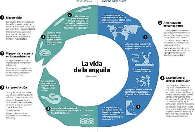 La anguila europea solo se reproduce una vez cada 20 años, más o menos, y además en un área concreta del mundo: el mar de los Sargazos (frente a las costas de Estados Unidos y el Caribe), el único mar del planeta que no está limitado por costas, sino que se encuentra en el interior de un océano, el Atlántico. Con menos de un año de edad, estos peces llegan a las costas europeas gracias al empuje de la corriente del Golfo. Aquí continúan su ciclo en hábitats como el Mar Menor, pero cada vez lo hacen alarmantemente menos. Antes de que la situación de nuestra albufera se tornase crítica, la 'Anguilla anguilla' ya estaba dejando de visitarnos con la profusión con la que lo hacía en el pasado. Desde el año 2000, en concreto, la llegada de ejemplares jóvenes al viejo continente cayó hasta suponer apenas entre el 1% y el 5% del número de las que lo hacían antes de 1980. Así lo estima la Unión Internacional para la Conservación de la Naturaleza (UICN), de la que forman parte más de 200 estados y agencias gubernamentales y por encima de 1.100 ONG, y que califica a la anguila europea en peligro crítico de extinción.