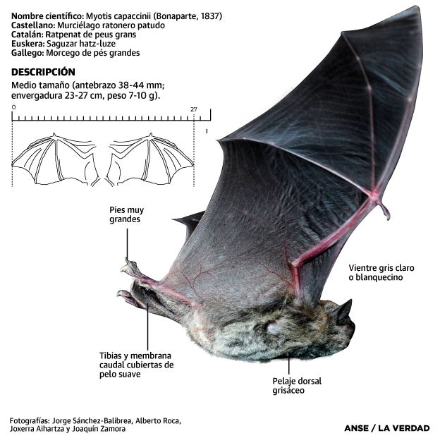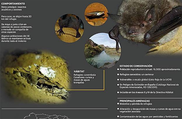 Por ahora, buena parte de lo que se conoce de este murciélago, fundamental como todos ellos para el control natural de plagas, lo muestra ANSE en la exposición itinerante que incluye su proyecto sobre el patudo, en las charlas que ya lleva impartidas en una treintena de colegios e institutos, en la web específica que ha habilitado sobre la iniciativa, en los 2.000 pósteres divulgativos sobre los que se ha basado la infografía que ilustra este reportaje y en el documental 'Myotis capaccinii', presentado el mes pasado en una jornada científico-técnica nacional sobre la especie que ANSE organizó en Santomera junto a la asociación conservacionista Meles.