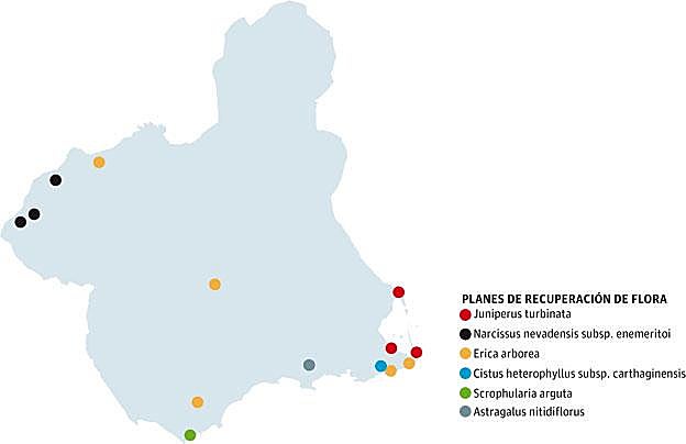 Las alarmas siguen encendidas para las seis especies vegetales de la Región en peligro de extinción. Ahora además, la amenaza de calentamiento global les puede poner todavía más sobre las cuerdas, «de una u otra manera, o bien por aumento de temperaturas o por modificación de los regímenes de precipitaciones», advierte Fulgencio Perona, director general de Medio Natural. En 2014 se aprobaron cinco planes de recuperación para la jara de Cartagena ('Cistus heterophyllus'), el brezo blanco ('Erica arborea'), la sabina de dunas ('Juniperus turbinata'), el narciso de Villafuerte ('Narcissus nevadensis subsp. enemeritoi') y la 'Scrophularia arguta' (especie de ortiga muerta de las rocas). A ellos se sumó en 2017 el garbancillo de Tallante ('Astragalus nitidiflorus'). La reducción de lluvias prevista afectará especialmente al brezo blanco, augura Perona. En todo caso, las más amenazadas de las seis siguen siendo la jara, el narciso y el garbancillo, advierte Jorge Sánchez, biólogo de la Asociación de Naturalistas del Sureste (ANSE). En los siguientes cuadros se repasa la situación de cada una.
