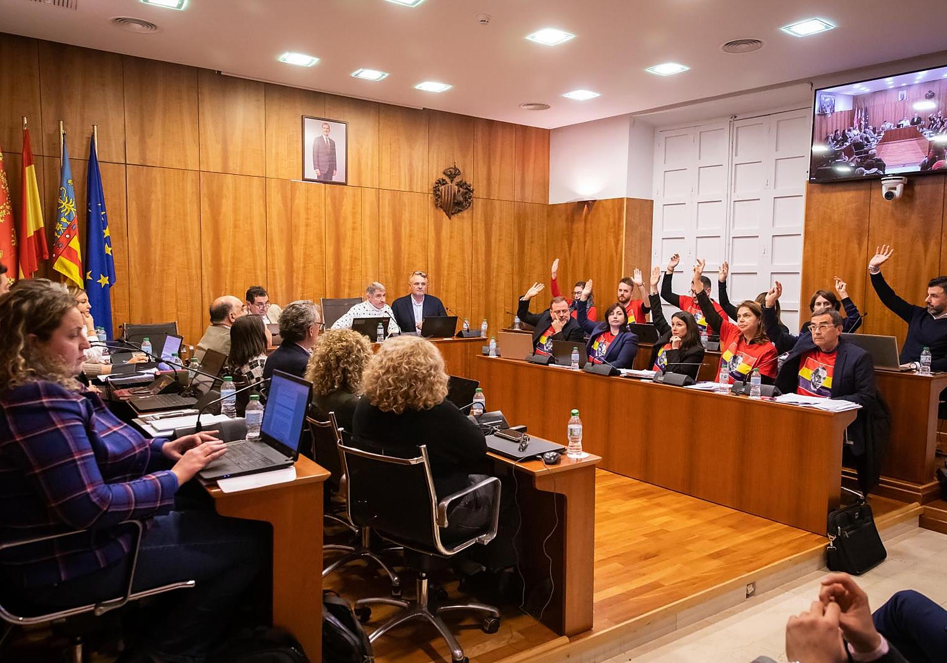 El debate de la moción discurrió con un clima de tensión ambiental y con concentrados a las puertas del Ayuntamiento. Todos reunidos con la clara voluntad de forzar lo que finalmente ha terminado por suceder este jueves. Los ediles del PSOE y Cambiemos, así como parte del público que tuvo la suerte de entrar al salón de plenos, acudieron con camisetas rojas serigrafiadas con la bandera republicana y el archiconocido retrato que Buero Vallejo dedicó a Miguel Hernández. Una imagen, por otra parte, que proliferado en las últimas semanas por calles y balcones de la ciudad.