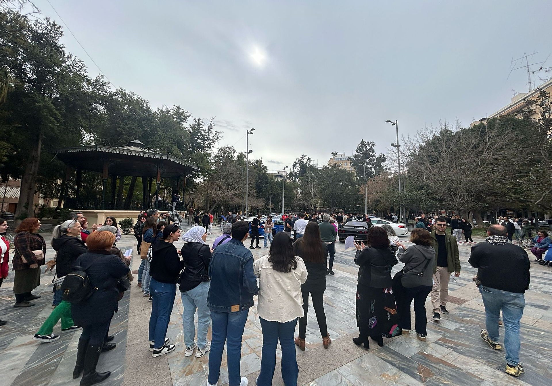 La jornada comenzó ya con los ánimos de protesta encendidos, con una concentración masiva en la que padres, madres, profesores y alumnos se reunieron de 10.00 a 12.30 horas en la Glorieta Gabriel Miró para manifestar su rotundo desacuerdo ante la decisión de las administraciones de convertir el IES El Palmeral en un Centro Integrado de FP. Esto supondría que más de 300 alumnos se tuvieran que reubicar de cara al próximo curso en el resto de institutos de la ciudad hacinados en barracones, que, además, se colocarían en zonas de alto riesgo de inundación.