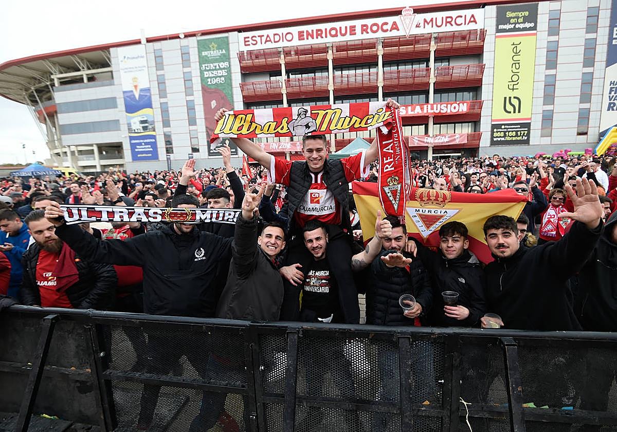 El nombre del ídolo exmadridista encendió aún más de lo habitual al fondo sur, acostumbrado a levantar los ánimos del público en los días de poco ambiente. No era el caso. Este domingo, 5 de marzo de 2023 (anótenlo), los espectadores no solo formaban un grupo hìpermultitudinario, sino también hipermotivado. «Adelante, vamos Real Murcia, adelante, sigue hasta el final, que esta tarde, cueste lo que cueste…!», animaban desde cada rincón de un estadio donde no faltaron banderas rojiblancas, bufandas, camisetas… El precio no era una excusa, porque salieron tiques por 1 y 2 euros.