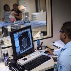 Médicos escanean el cerebro de un recién nacido para detectar un posible caso de microcefalia en Brasil.