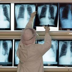 Una enfermera revisa las radiografías de pacientes afectados por neumonía.