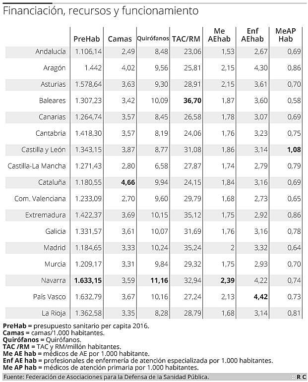 Un paciente navarro o uno vasco tienen una atención sanitaria casi el doble de buena que uno canario, según un informe de la Federación de Asociaciones para la Defensa de la Sanidad Pública. Tras analizar variables como la inversión presupuestaria por habitante, el número de camas, de quirófanos y de médicos y la satisfacción de los usuarios, entre otros baremos, la entidad subraya que los recortes sanitarios llevados a cabo en los años de la crisis no solo mermaron al sistema en general, sino que abrieron una brecha entre regiones aún mayor que la que existía.