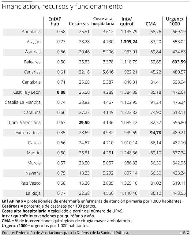 De acuerdo al informe, la puntuación máxima que podría haber alcanzado una región sería 114 y la mínima, 28. Navarra y País Vasco, las dos mejores, llegan a los 90 puntos. Tras ellas se encuentran Aragón (82) y Asturias (79), que también están en una situación aceptable. Con servicios sanitarios regulares aparecen Castilla y León (78), Castilla-La Mancha (77), Extremadura (77) y Galicia (76); con servicios deficientes, La Rioja (69), Cantabria (65), Madrid (65), Baleares (63) y Murcia (61); y finalmente, los peores servicios sanitarios del país corresponden a Andalucía (60), Cataluña (60), la Comunidad Valenciana (59) y Canarias (49).