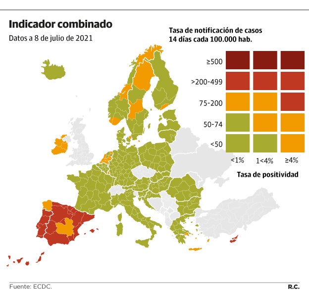 El problema para España es que no se trata de un mapa más, ya que estas actualizaciones -admiten en Sanidad- son una de las principales referencias internacionales sobre la evolución pandémica para los gobiernos de los 27. En particular, el mapa que tanto inquieta a las autoridades españolas es el más completo de todos los que elabora el ECDC porque en él se aumenta la tonalidad combinando dos parámetros: la incidencia acumulada y la tasa de positivos.