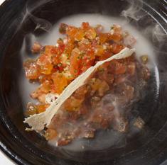 Tartar de tomate ahumado. Se hace con tomate natural ahumado y tomate seco picado, y el aliño es una pasta de tomate reducida que lleva algún tipo de chile. Es un plato picante. En medio se le coloca una loncha muy fina de pan crujiente, que se ha hecho con pan congelado, deshidratado y tostado. Como condimento, se le añade perejil o cebollino picado.