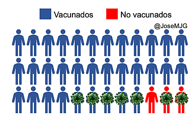 Imaginemos un país con 36 personas pertenecientes a grupos riesgo donde el 91 % de estas personas ha recibido las dos dosis de la vacuna y el 9 % no se ha vacunado.