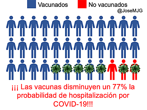 Pasa el tiempo y vemos que en el grupo de los vacunados 5 personas se han infectado requiriendo hospitalización y en el grupo de no vacunados esto solo ocurre en 2 personas. Ya tenemos el titular: ¡El 71 % de los hospitalizados por covid-19 son personas vacunadas!