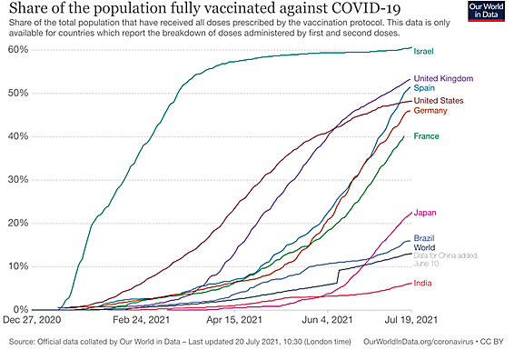 Sin embargo, aunque no vaya a ser del 100 %, sí que se espera una cobertura de vacunación bastante alta (al menos en adultos). En la siguiente imagen podemos ver el porcentaje de población completamente vacunada en distintos países: