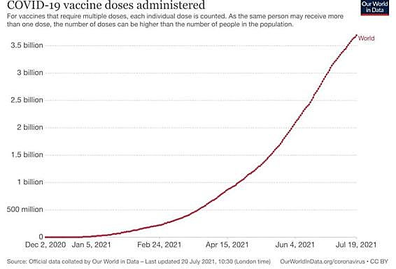 En la siguiente imagen podemos ver el número de dosis de las diferentes vacunas administradas en el mundo. En lo que llevamos de pandemia se han administrado más de 3 500 millones de dosis: