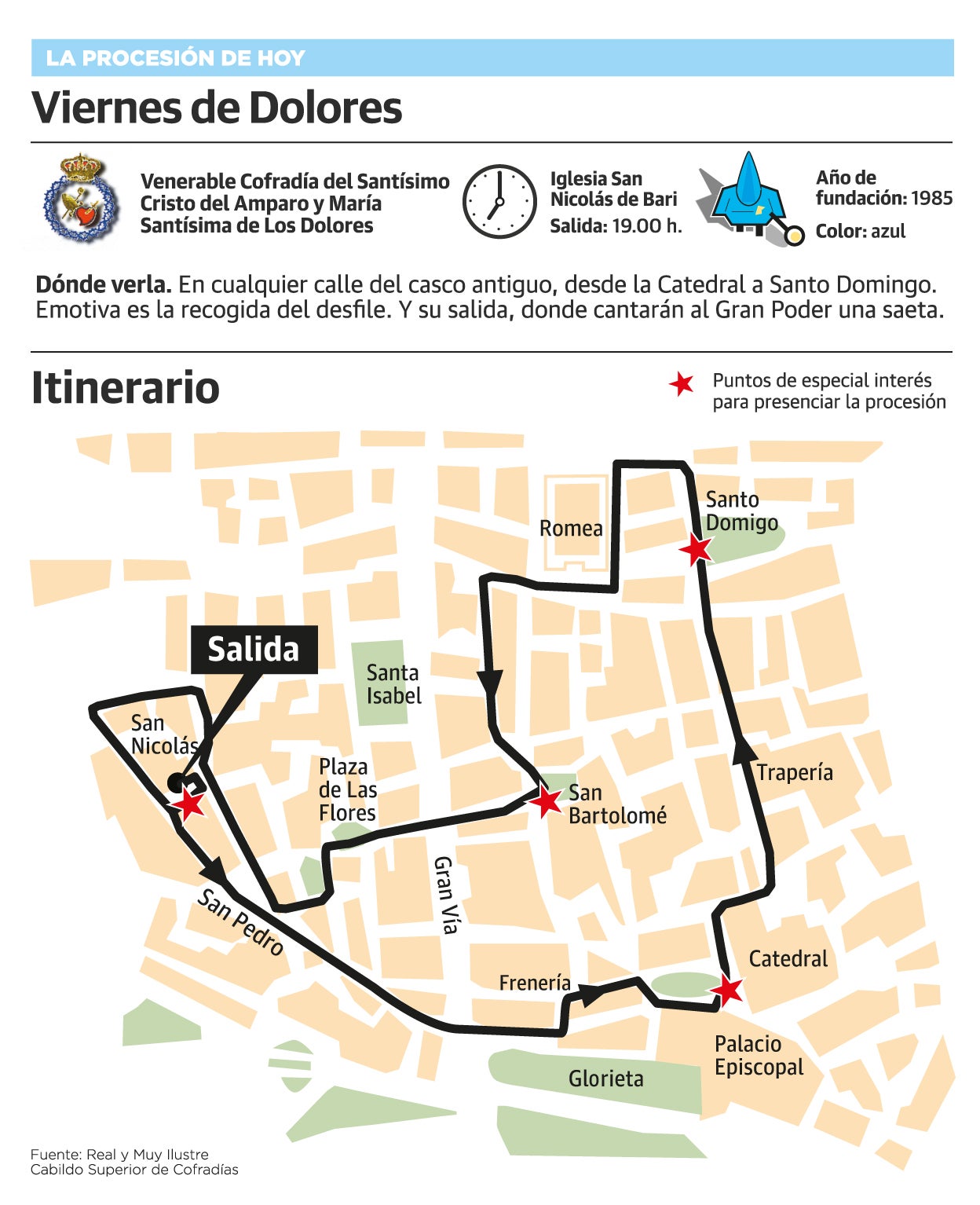 El azul de sus túnicas nazarenas discurrirá por la ciudad, desde el primer paso de la institución –un Ángel de la Pasión de Roses– hasta el trono del titular. En total, esta institución recorrerá 2,3 kilómetros y su tiempo estimado de paso es poco más de hora y media.