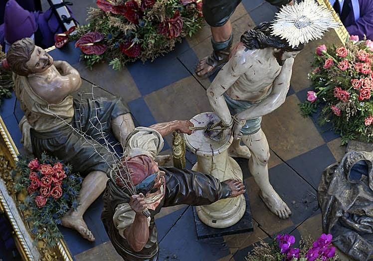 En el exterior del templo, la impaciencia y el deseo se fundían entre los vecinos. Dentro, el nerviosismo entre penitentes y portapasos se palpaba en el ambiente. Pocos segundos pasaban de las 8.00 horas cuando el primer estandarte, precedido de las primeras bocinas, abrió de una vez las puertas. El barrio de San Andrés dio una calurosa bienvenida a los primeros nazarenos 'moraos' y a La Santa Cena, primer paso de los 'salzillos'. Desde ahí, la procesión enfiló el barrio de San Andrés con el deseo de volver a saborear la gloria de enseñar las ocho imágenes del escultor Francisco Salzillo y el paso que es de autor anónimo.