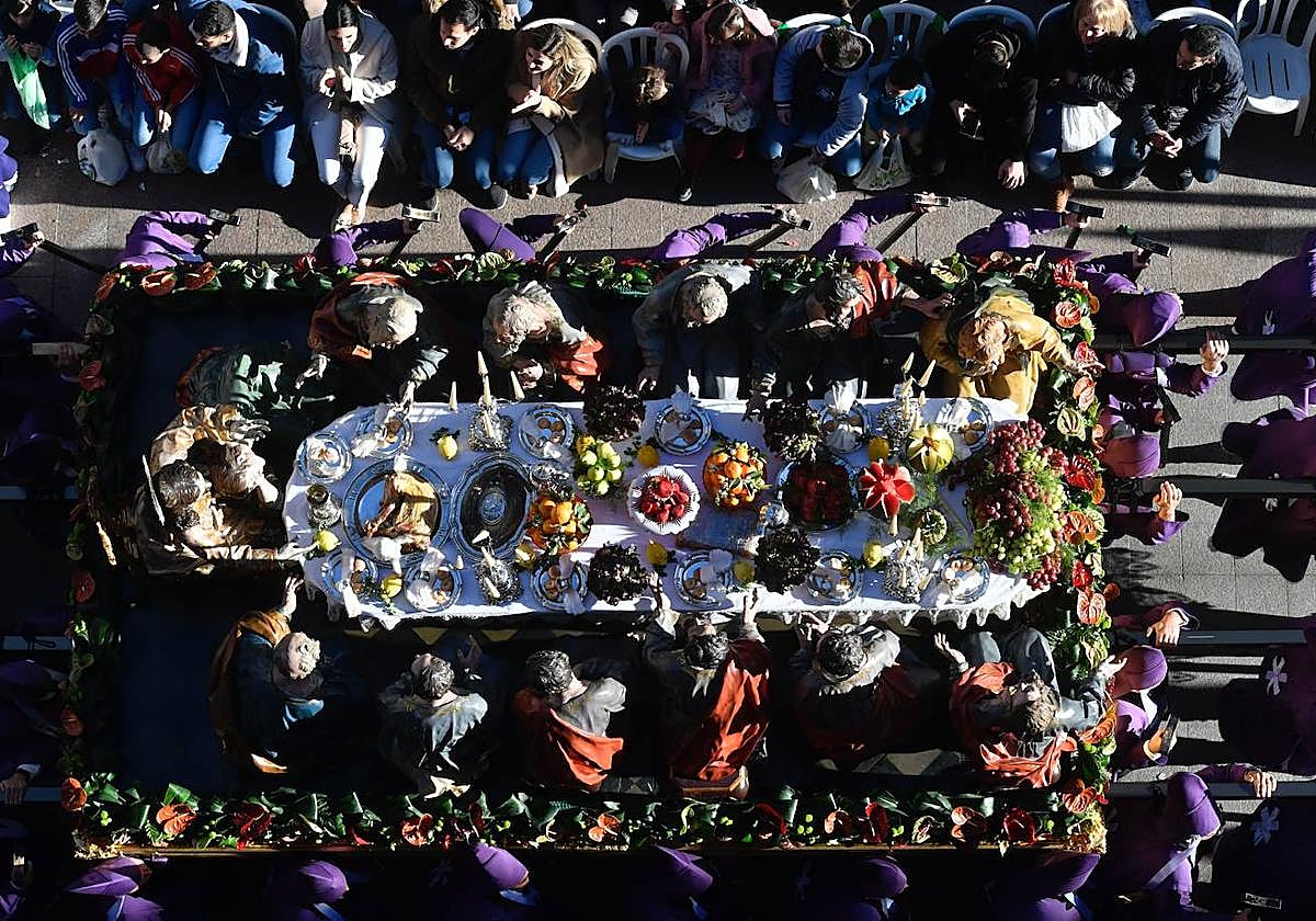 Murcia madrugó con gusto este viernes. El frío de las primeras horas del día no era problema, había cómo combatirlo. Los que se acercaron a la puerta de la iglesia privativa pudieron disfrutar de un chocolate caliente en la plaza San Agustín, donde se instalaron unas barras para endulzar aún más la mañana y subir la temperatura. El sol no tardó en aparecer, tampoco quería perderse la cita. Y con él, poco antes de las 8.30, La Santa Cena, el primero de los pasos, que fue arropado por los aplausos de los allí presentes.