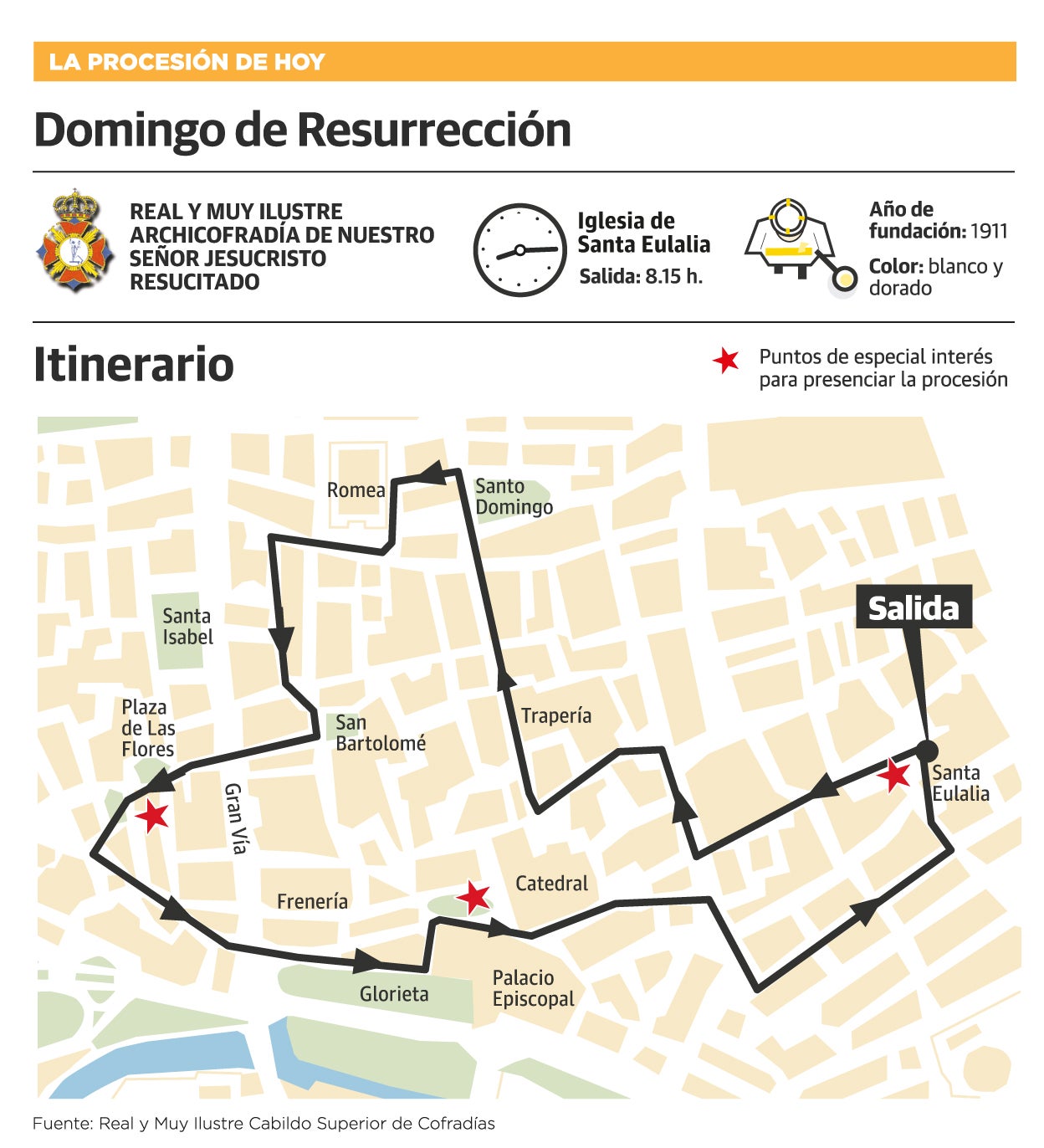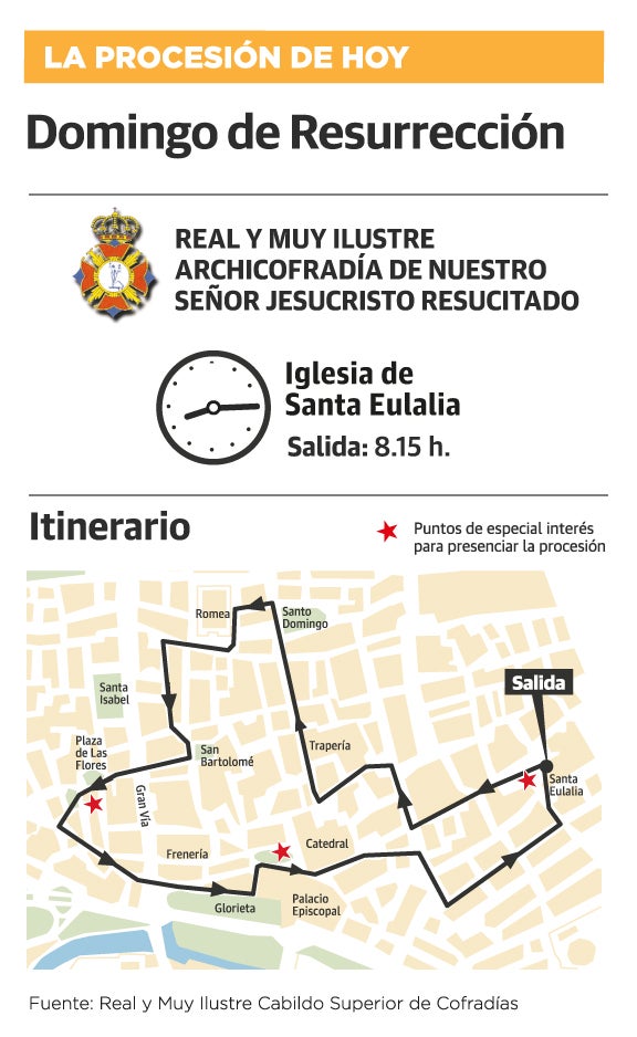 La previsión meteorológica no arroja dudas: temperaturas primaverales, tirando a veraniegas, y cielos despejados, lo que ayer ya animó a muchos murcianos a decidir participar en el cortejo y, sobre todo, a vivirlo a lo largo de su carrera nazarena, sin duda atestada de bares y restaurantes colmados de gentes. A primera hora de la mañana empezarán a repicar las campanas de Santa Eulalia, sede canónica de la Archicofradía del Resucitado. En el cielo se dispararán cohetes y las saetas darán paso a los himnos de fiesta.