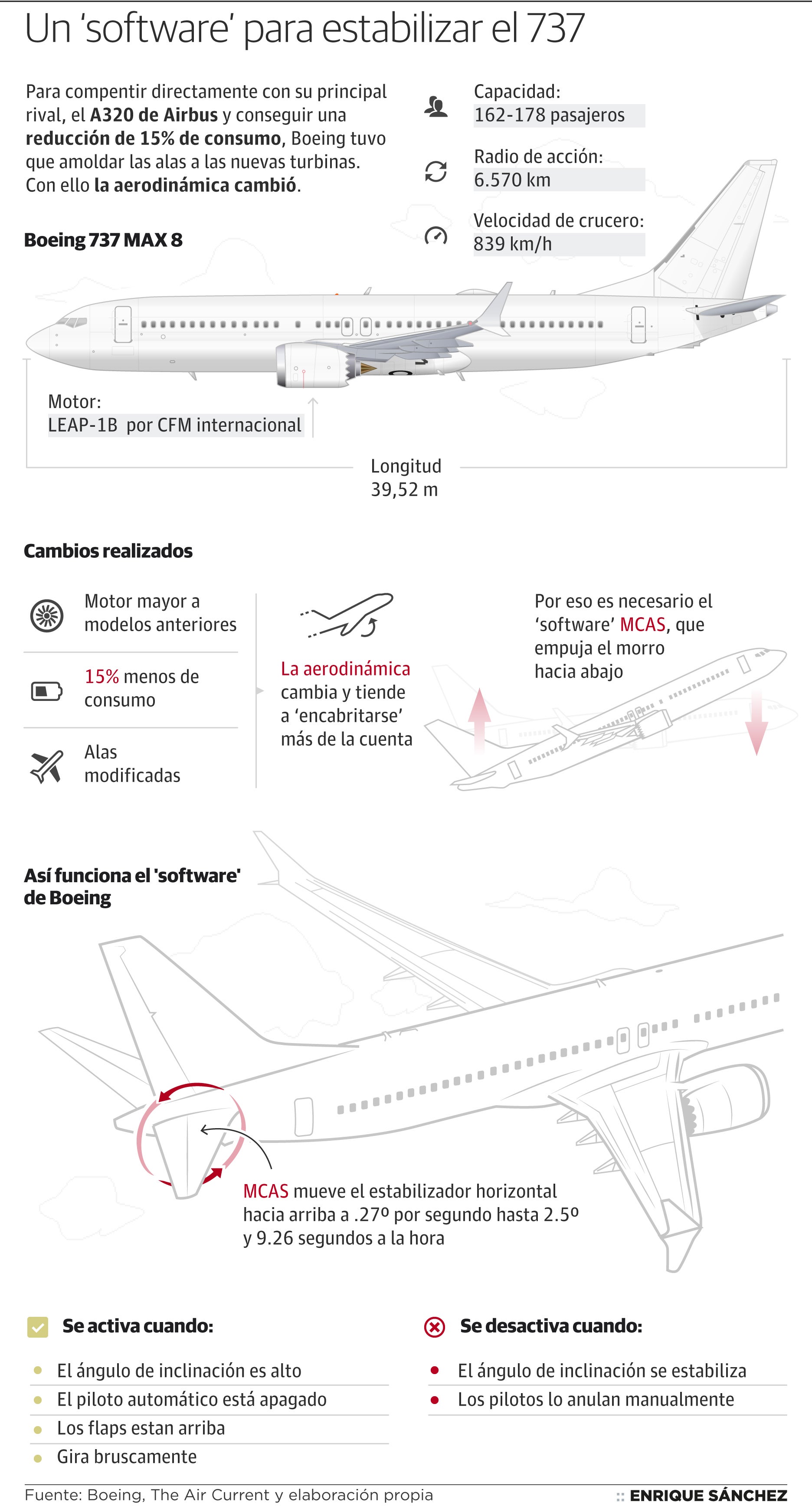 Es decir, que el problema del 737 MAX podría estar en la innovación estrella de la marca: el sistema de ajuste automático del timón de profundidad (MCAS, por sus siglas en inglés). Técnicamente, este software debería aportar mayor seguridad al aparato ya que corrige automáticamente posiciones que podrían ser peligrosas para el avión, pero también desestabilizarlo si se produce un fallo en el sistema.