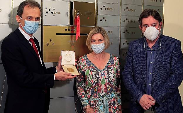 Pedro Duque deposita en una caja de Seguridad del Cervantes la medalla del Nobel Ramón y Cajal. FERNANDO ALVARADO/EFE