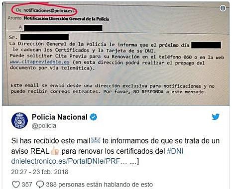 «Si has recibido este mail te informamos de que se trata de un aviso REAL para renovar los certificados del #DNI», así lo ha confirmado la Policía Nacional en su perfil de Twitter.