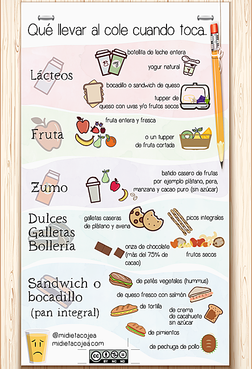 Así, entre los alimentos más adecuados podemos encontrar los lácteos, en los que se incluye la leche entera, un yogur natural o un sandwich de queso, fruta, zumos caseros hechos con varios tipos de frutas, dulces o galletas siempre que sean caseros y no industriales y, por último, un sandwich o bocadillo de pan integral con patés vegetales, salmón, pollo, tortilla o crema de cacahuete sin azúcar.