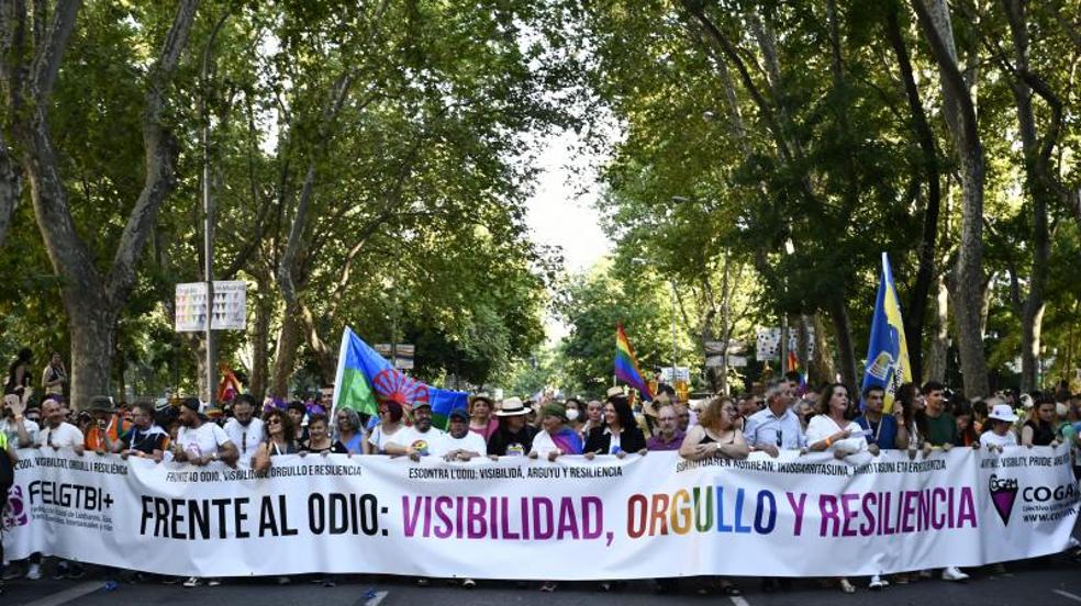 La marcha, que recorrió durante más de dos horas los cuatro kilómetros y medio que separan la glorieta de Atocha de la plaza de Colón, arrancó sobre las siete de la tarde tras la pancarta con el lema principal de esta edición, 'Frente al odio, Orgullo, visibilidad y resiliencia'. Lo portaban los representantes de las principales organizaciones LGTBI y tras ellos marchaban responsables de sindicatos, asociaciones y ONG, los portavoces de la sociedad civil. En un tercer bloque ya estaban los dirigentes de todos los partidos políticos salvo PP y Vox, entre ellos estaban ministros socialistas como Fernando Grande-Marlaska, Diana Morant o Pilar Alegría, o de Podemos, como Ione Belarra e Irene Montero.