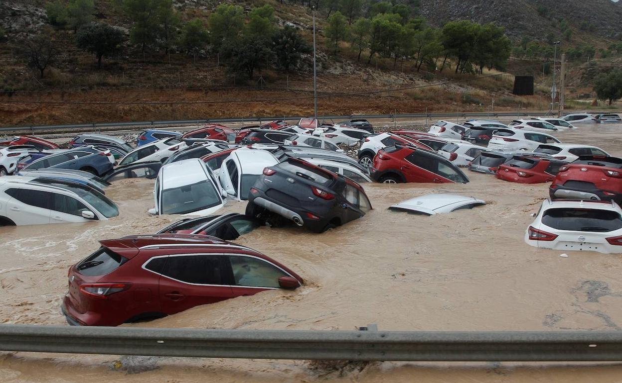 Cientos de coches permanecen inundados tras el paso de la Gota Fría en un depósito de vehículos en Orihuela (Alicante). EFE