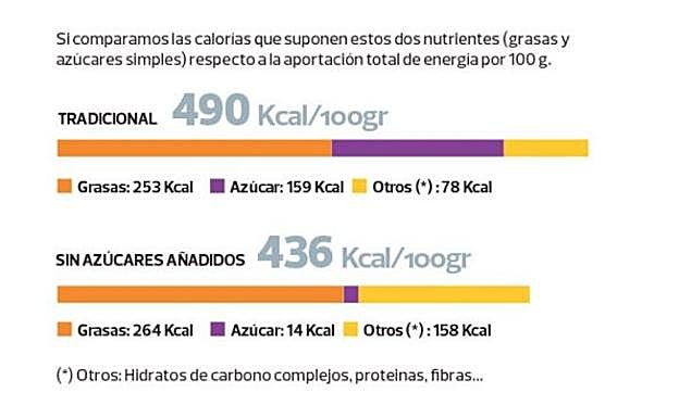 En la citada gráfica se puede apreciar como los turrones sin azúcar añadidos contienen solo 54 calorías menos que uno tradicional. Como siempre la organización insta a los consumidores a no fiarse de las etiquetas y sus mensajes y comprobar ellos mismos la tabla nutricional.