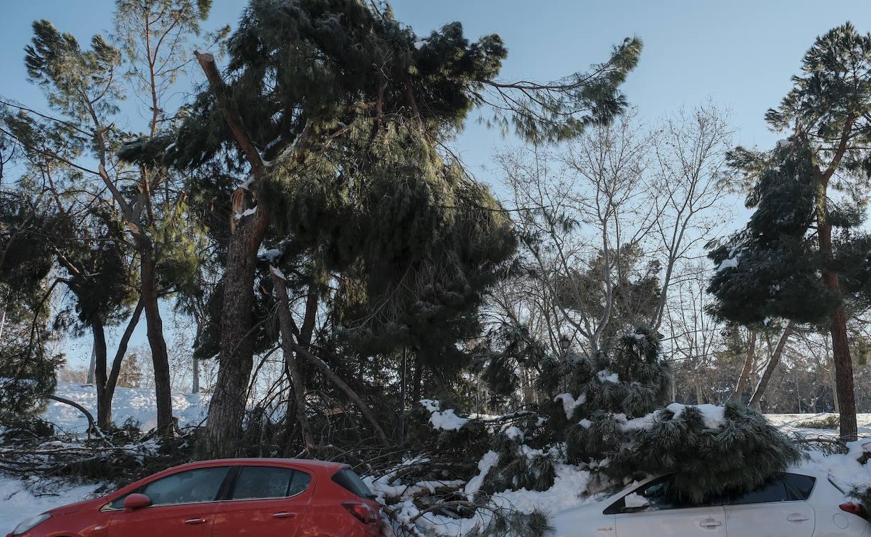 El temporal 'Filomena' ha perpetrado una matanza verde especialmente cruenta en Madrid. Incapaces de soportar el peso de la nieve, muchos árboles han visto cómo sus ramas se tronchaban o sencillamente su tronco se partía en dos. Es pronto aún para saber la magnitud del desastre, pero el Ayuntamiento calcula que 150.000 ejemplares de los 800.000 que se encuentran en zonas verdes y el eje viario de la capital han quedado dañados, lo que supone un 20% del conjunto. La catástrofe sobre la masa arbórea se ha sentido con especial intensidad en la Casa de Campo.