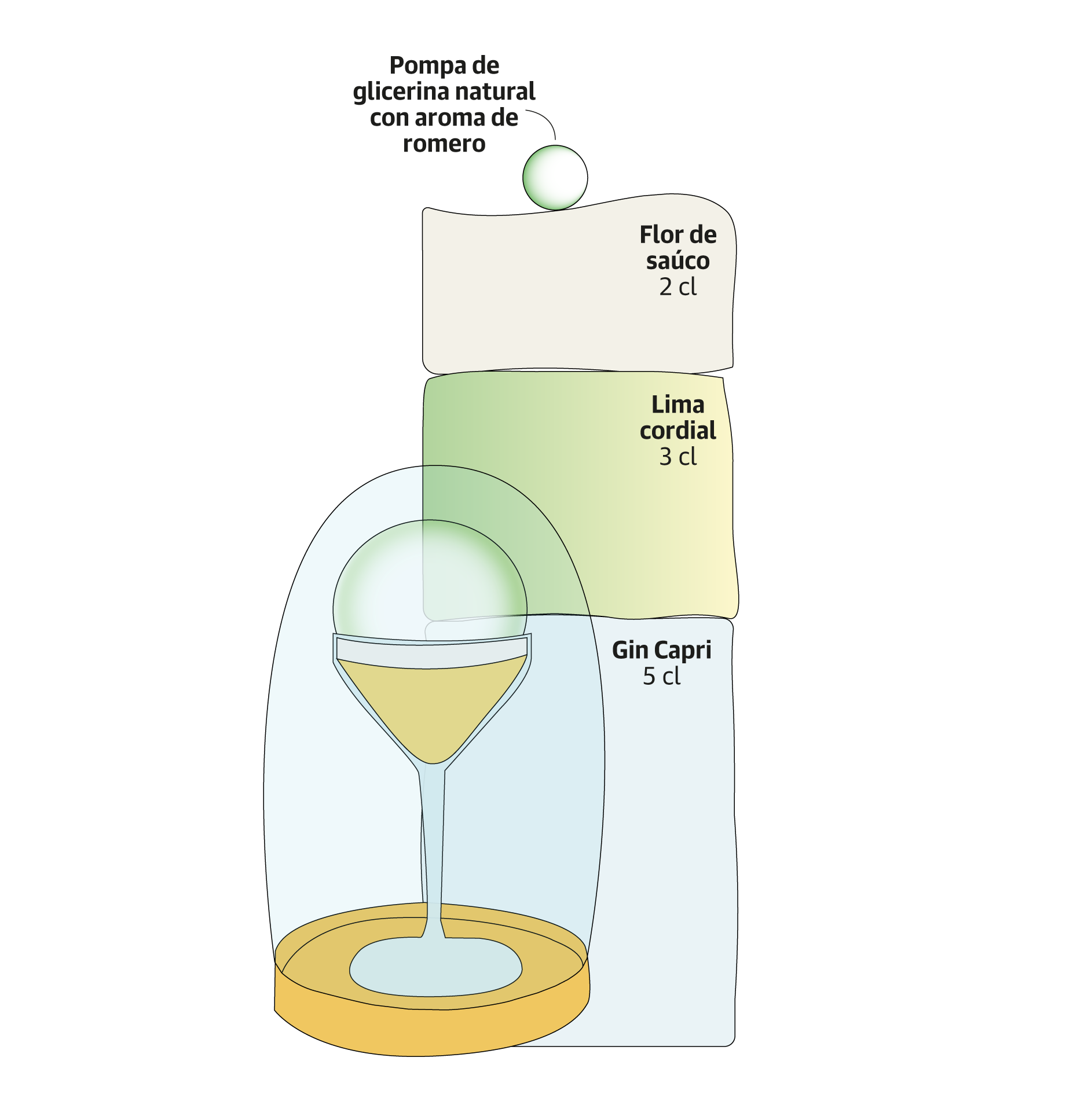 Consiste en abrir una campana de cristal y encontrar una copa donde se ha encapsulado un aroma de romero en una muy sutil y frágil pompa de glicerina vegetal. Tras explotarla con la nariz, desaparece el aroma y encontramos el logo comestible en forma de 50 flotando sobre ginebra, lima y flor de saúco.