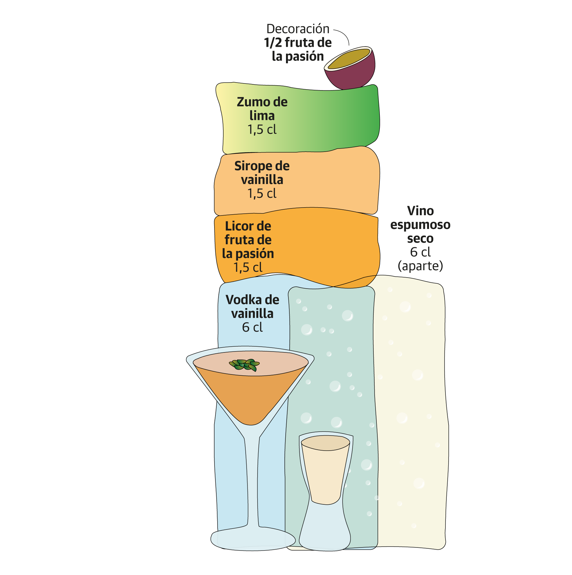 Quizás lo más original de esta bebida sea que se sirve en dos partes separadas para limpiar el dulzor del paladar con el vino espumoso. De ahí que siempre se recomienda un vino Brut.