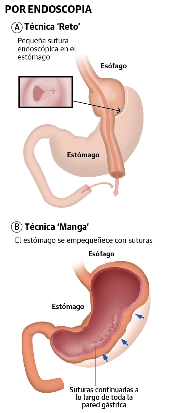 En caso de que se requiera una intervención, como primera alternativa, previa a la cirugía, se opta por técnicas endoscópicas. También se denominan técnicas restrictivas, porque buscan reducir el tamaño del estómago, no mediante la extirpación de una parte, sino mediante la anulación funcional de una parte, según detalla el codirector del Área de Obesidad, Víctor Valentí. Ese objetivo se logra mediante la realización de dos minúsculos agujeritos en la tripa, por donde se introduce el instrumental. Así se reducen las señales que el estómago manda al cerebro para informarle de la necesidad de comer.