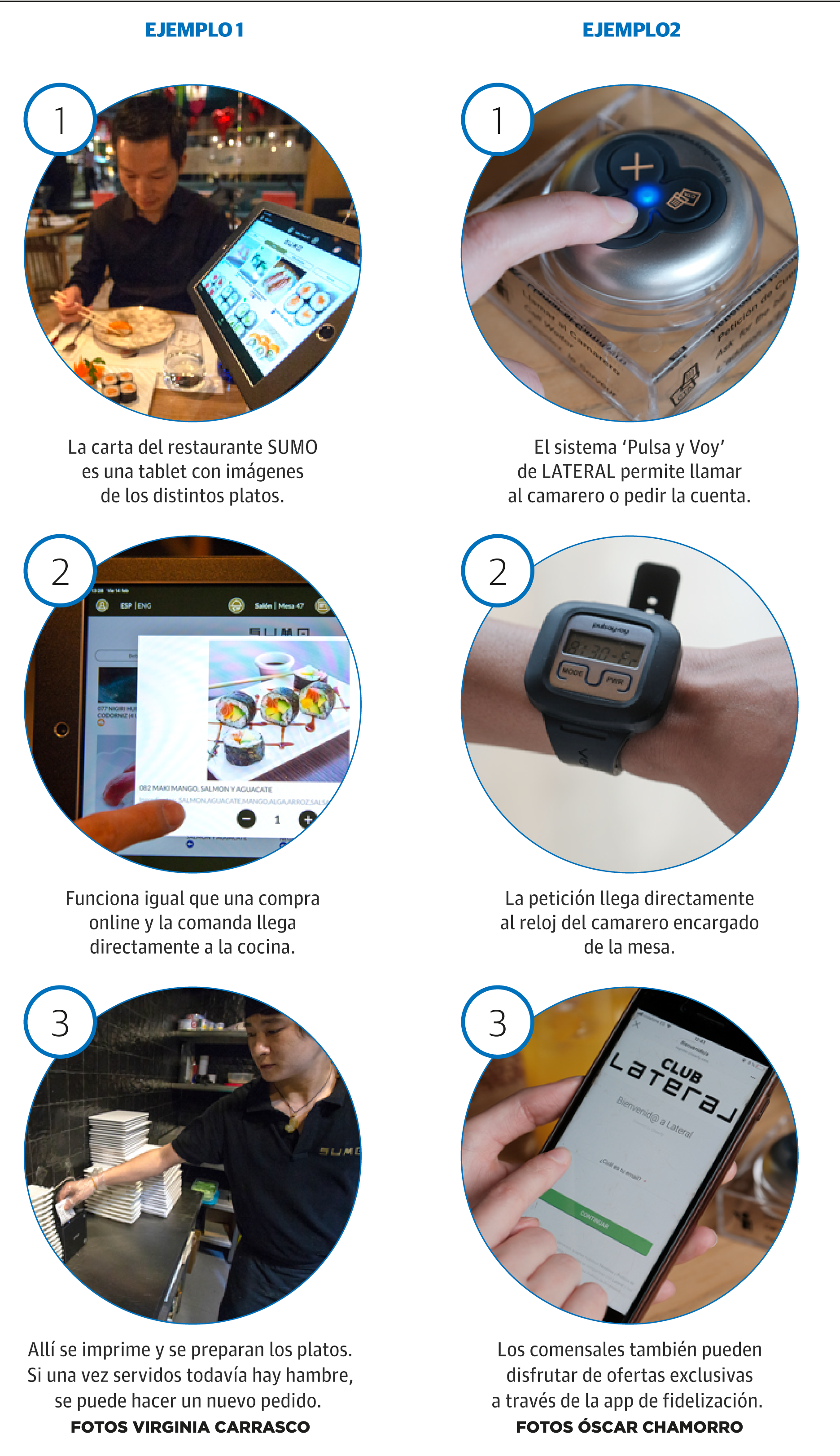 Está claro que nos gusta socializar en torno a una mesa, y también que cada vez somos más exigentes, pero ¿que tienen que ver con todo esto los robots? Pues tiene, porque aunque hoy son solo una anécdota ya hay establecimientos en España donde la comida la sirven estas máquinas y no seres humanos, como ocurre en el restaurante Amazonia Chic, en Madrid. Lo que sí se ven cada vez más son herramientas como el 'Pulsa y voy' del restaurante Lateral, un mecanismo que permite pedir la cuenta o llamar al camarero fácilmente; o los menús interactivos del restaurante SUMO, que sustituyen la tradicional carta de papel por una tablet donde se pueden ver los platos, entre otros.