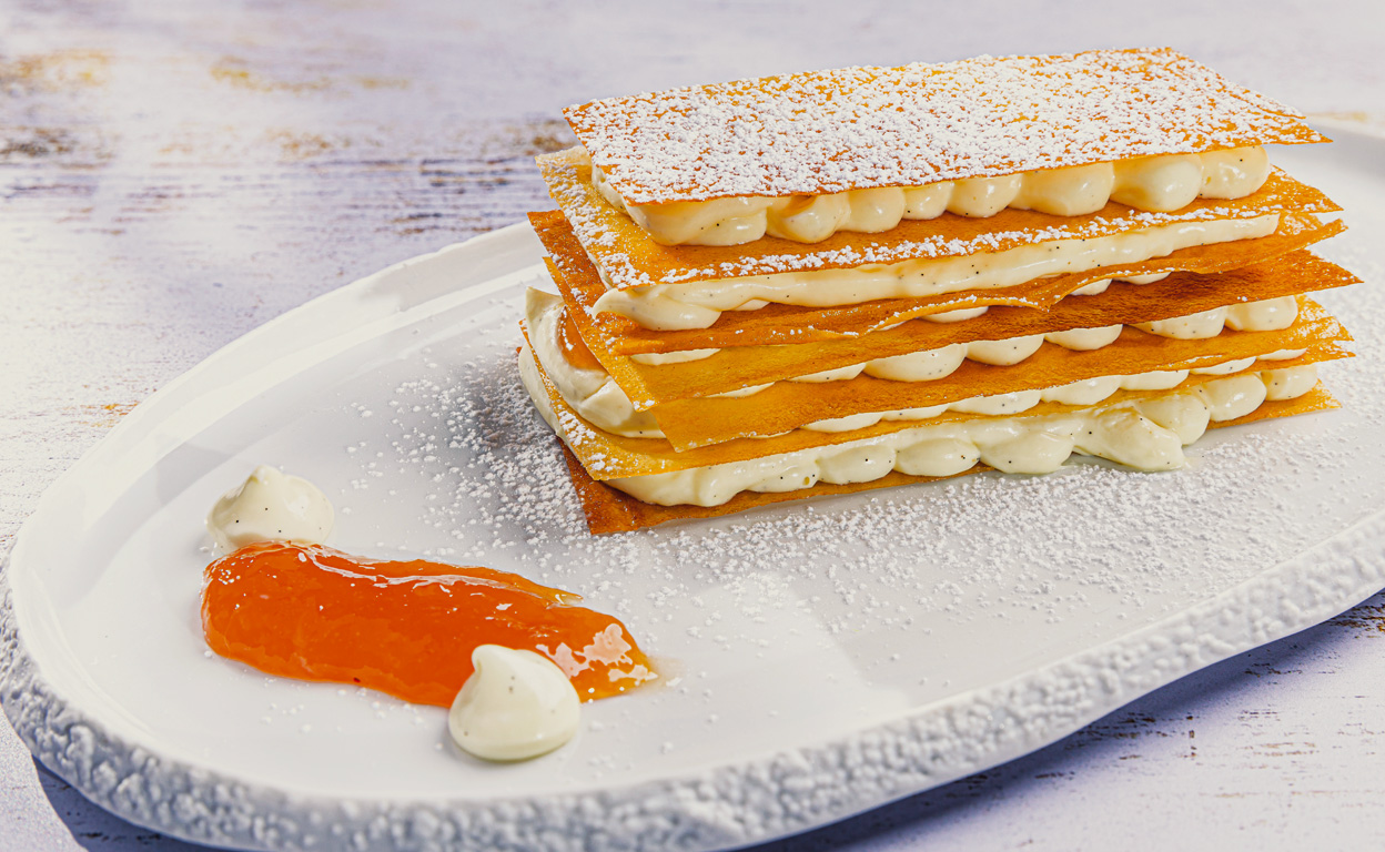 Podemos incluir fruta de temporada entre las capas de las milhojas, colocando sobre la crema frambuesas, fresas o láminas finas de mango pelado. También podemos cambiar la mermelada de naranja amarga por mermelada o jalea de otros sabores.