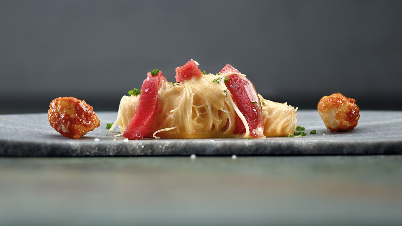 Acabado: con unas pinzas largas o un tenedor se hacen unas madejas con los fideos calientes aliñados y se colocan en el centro de unos platos. Por encima, se apoyan delicadamente los lomos de atún rojo loncheados y las macadamias garrapiñadas