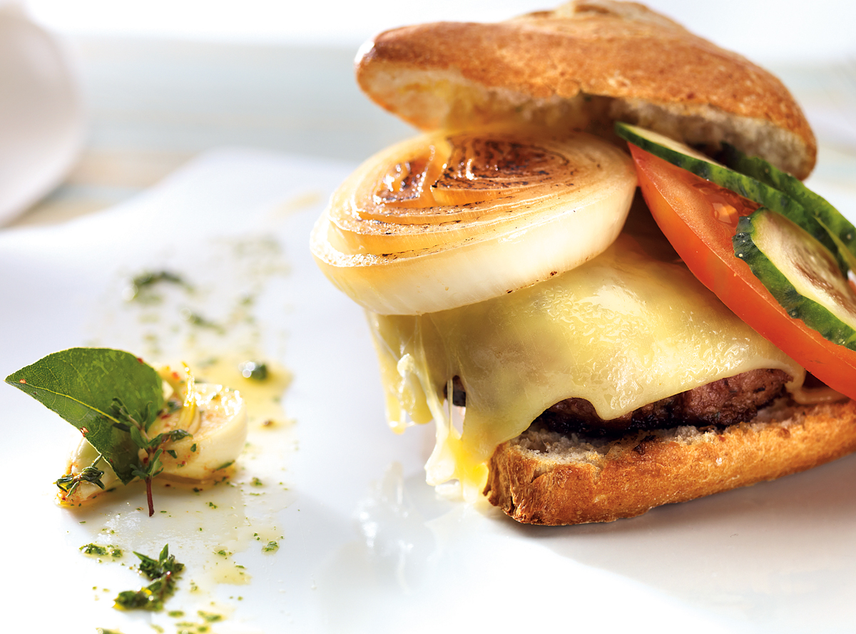 4. En una sartén con unas gotas de aceite de oliva se hacen las hamburguesas por las dos caras hasta que queden doradas (si se quiere que queden más hechas, se hornean unos minutos con las láminas de queso encima para que se fundan bien), se corta el pan por la mitad, se hornea durante unos minutos y se untan las dos mitades con la salsa de chimichurri, se coloca la hamburguesa encima y sobre ella, el resto de vegetales.