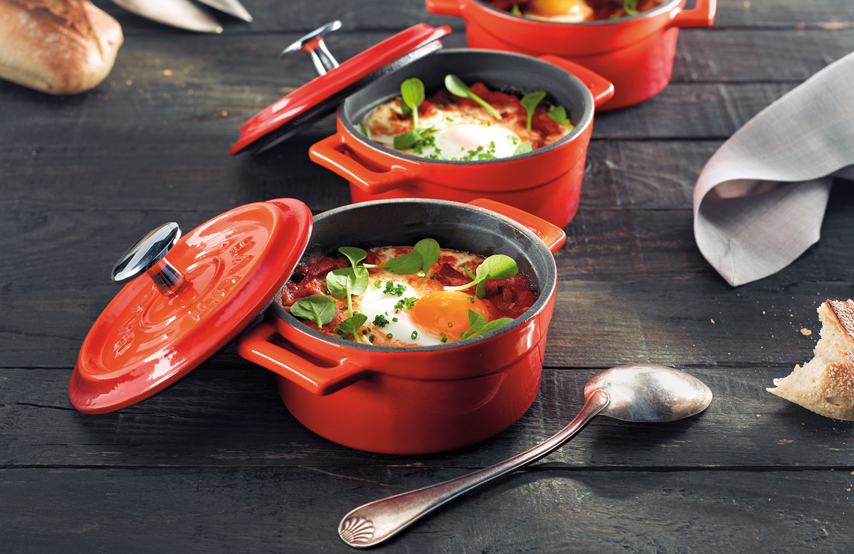 4. Sazonamos, las acomodamos en cazuelitas, cubrimos con el sofrito y hacemos unos pozos con el dorso de una cuchara, para cascar en su interior un huevo. Salpimentamos. Metemos las cazuelitas al horno y dejamos que cuajen las claras ligeramente. Las yemas deben quedar jugosas, sin que se sequen.