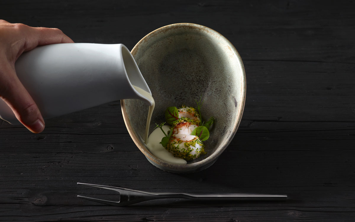 3. Acabado: para el rebozado de yema, se pican todos los ingredientes y se reúnen en un bol, mezclando cuidadosamente y añadiendo una pizca de pimienta. En una sartén antiadherente se doran a fuego vivo las vieiras salpimentadas por sus dos caras, dejándolas doradas fuera y muy jugosas y tiernas por dentro, sin secarlas. Se escurren, se embadurnan en el rebozado de yema recién hecho para que se pringuen y se colocan en el fondo de varios platos hondos.
