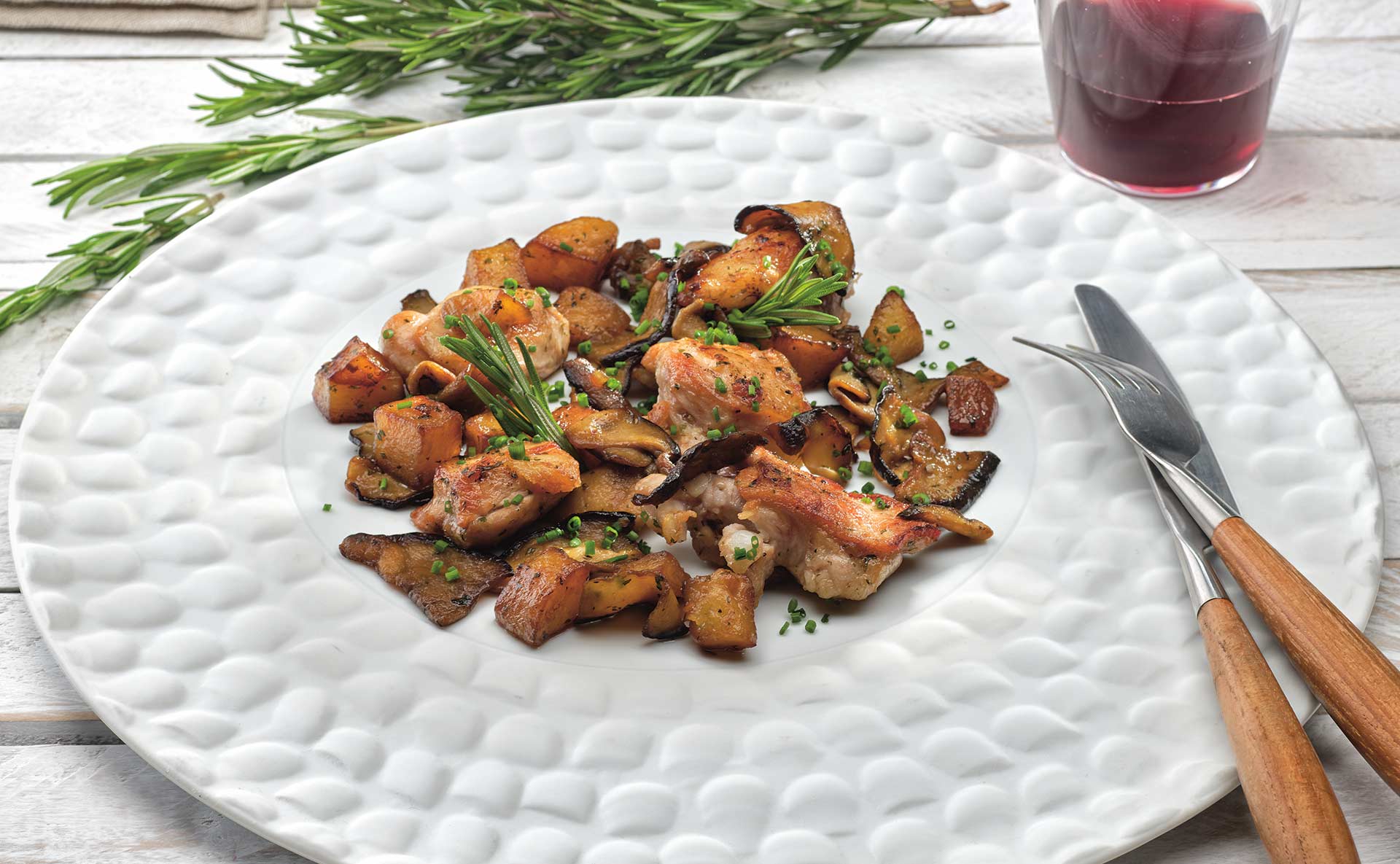 Acabado: entonces agrega las patatas tostadas sobre los hongos y da unas vueltas para que se integren, incorporando el ajo picado y el perejil, sin dejar de remover unos minutos más. Por último, añade los dados de cordero con el jugo que hayan podido soltar y continúa rehogando unos minutos más para que les vuelva a entrar el calor y las patatas y los hongos cojan el gusto de la carne.